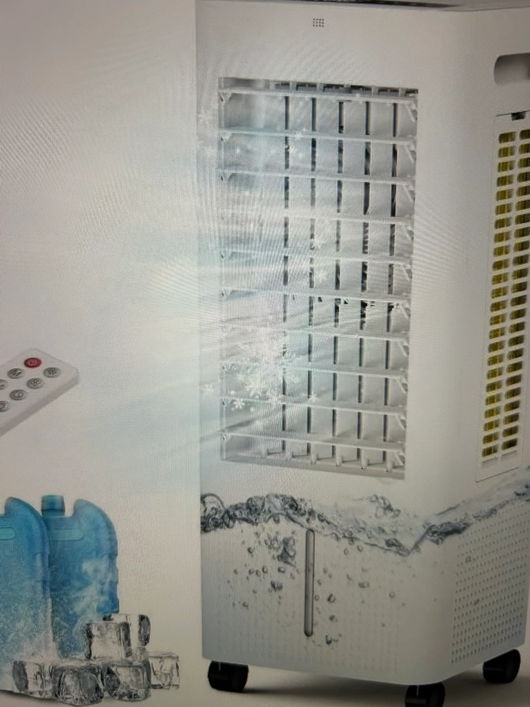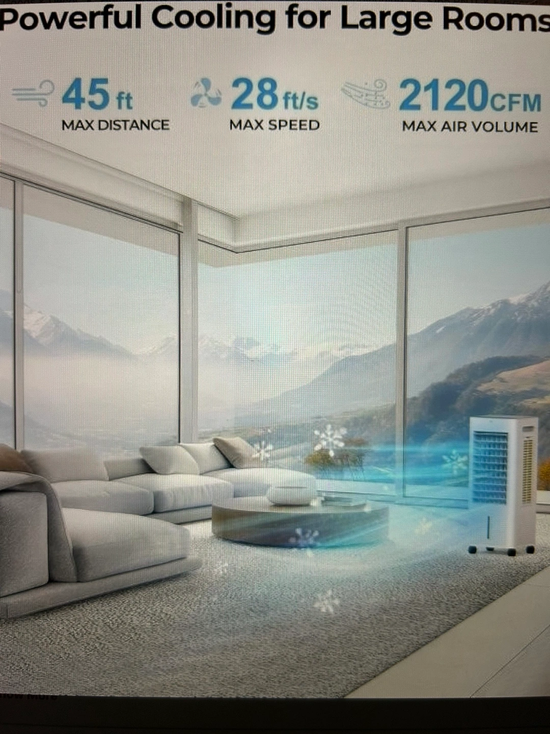 Keep cool this summer with an evaporative air cooler! It's designed for powerful cooling in large rooms, reaching up to 45ft with a max speed of 28ft/s and 2120 CFM air volume. Great for those hot days!