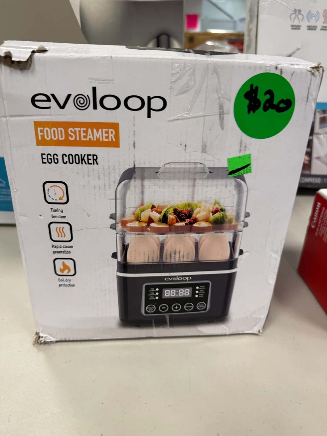 I'm selling a brand new Eveloop Food Steamer and Egg Cooker! It has a timing function, rapid steam generation, and boil dry protection. It comes in the original box. Originally priced at $20