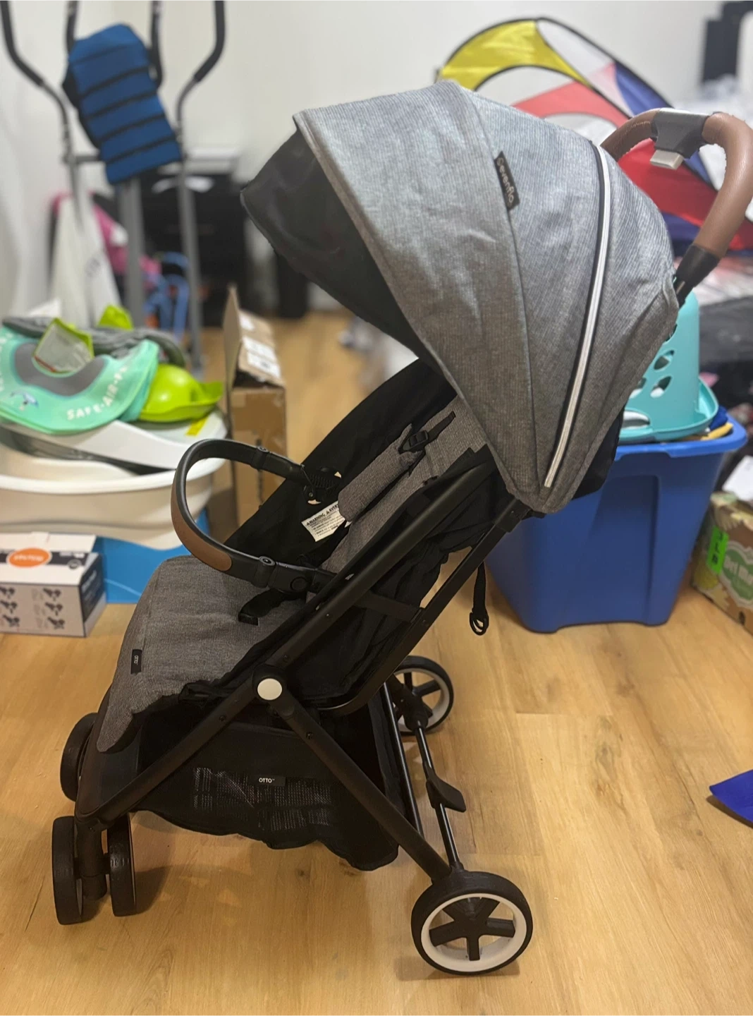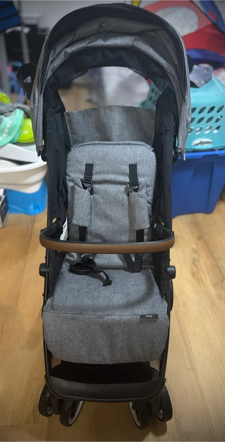 Looking to sell an Evenflo stroller in great condition! It's a stylish and practical stroller, perfect for getting around town with your little one. The stroller is grey and features a brown handle, adding a touch of elegance. It's lightweight and easy to fold, making it convenient for travel and storage. Comes with a cup holder. Ideal for warm/summer weather.