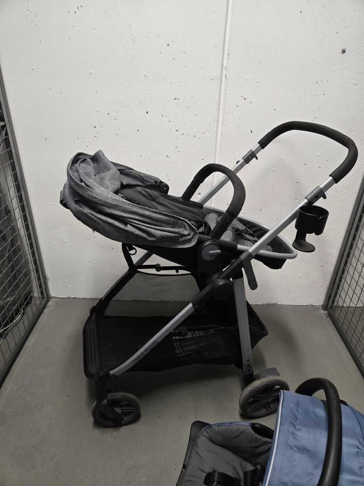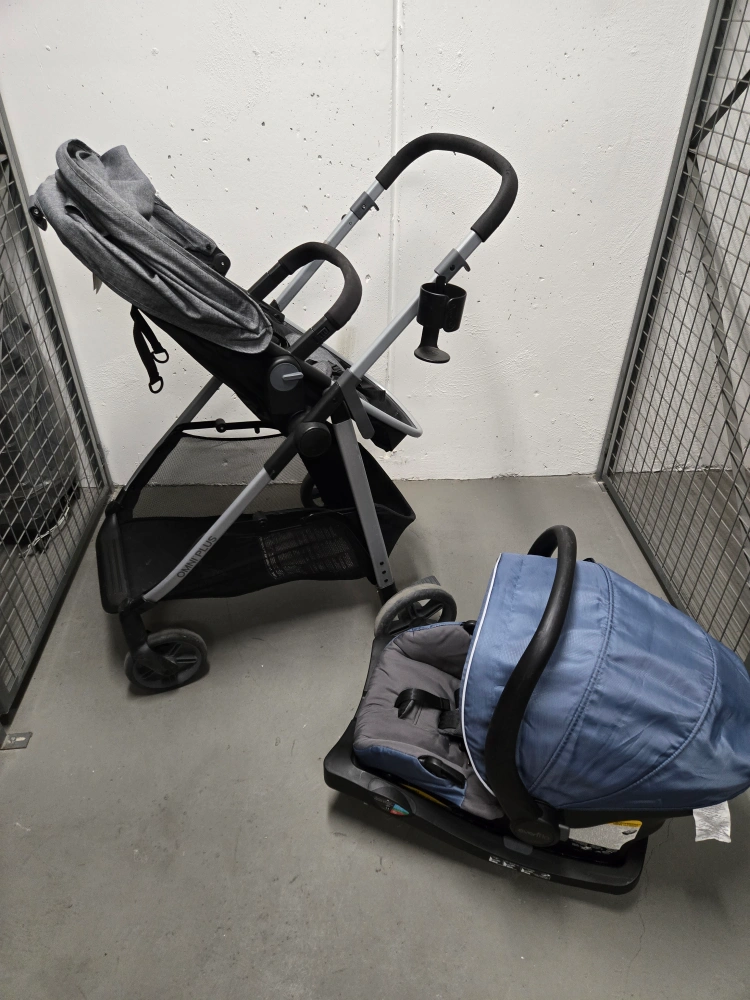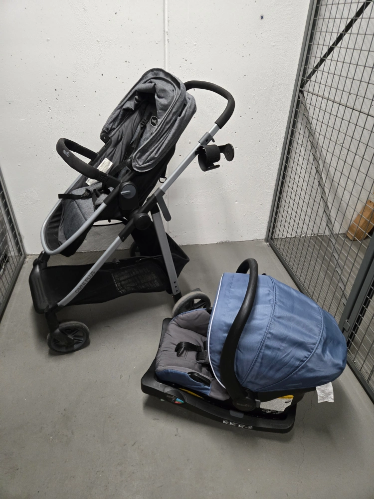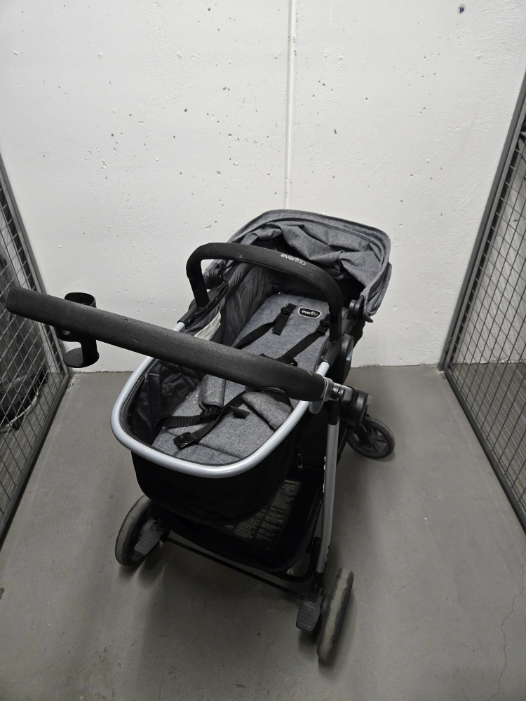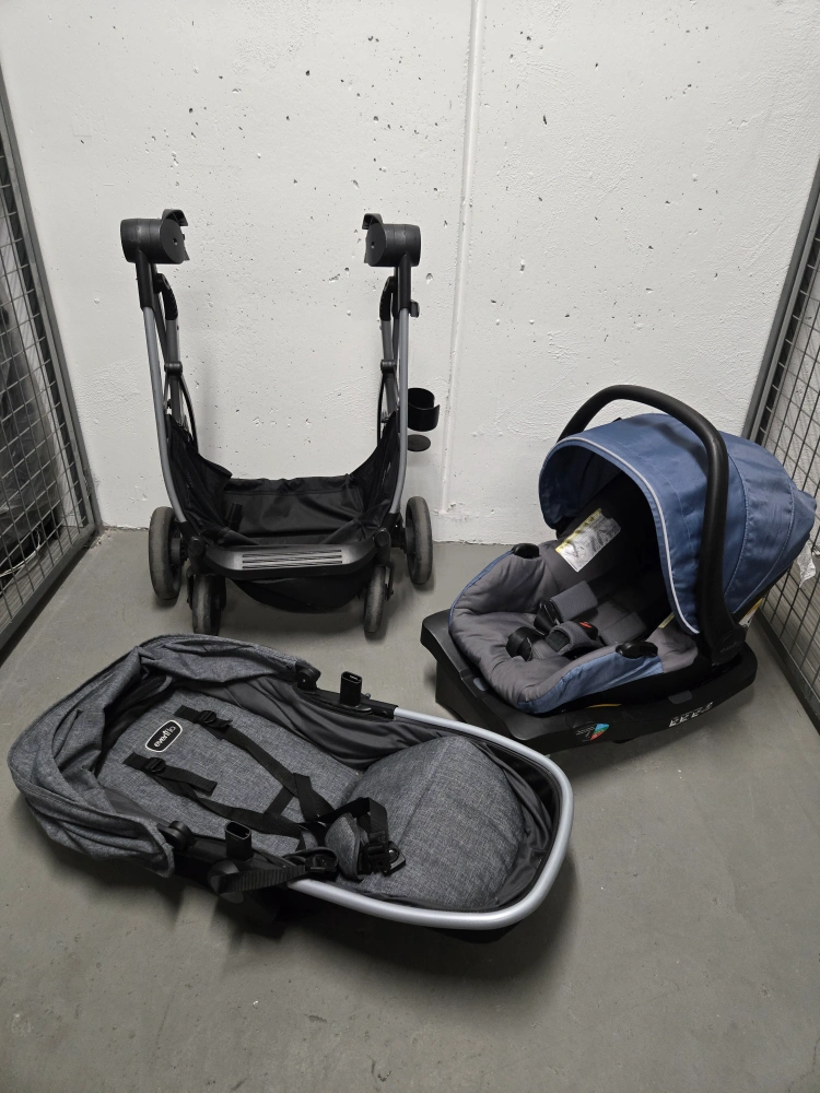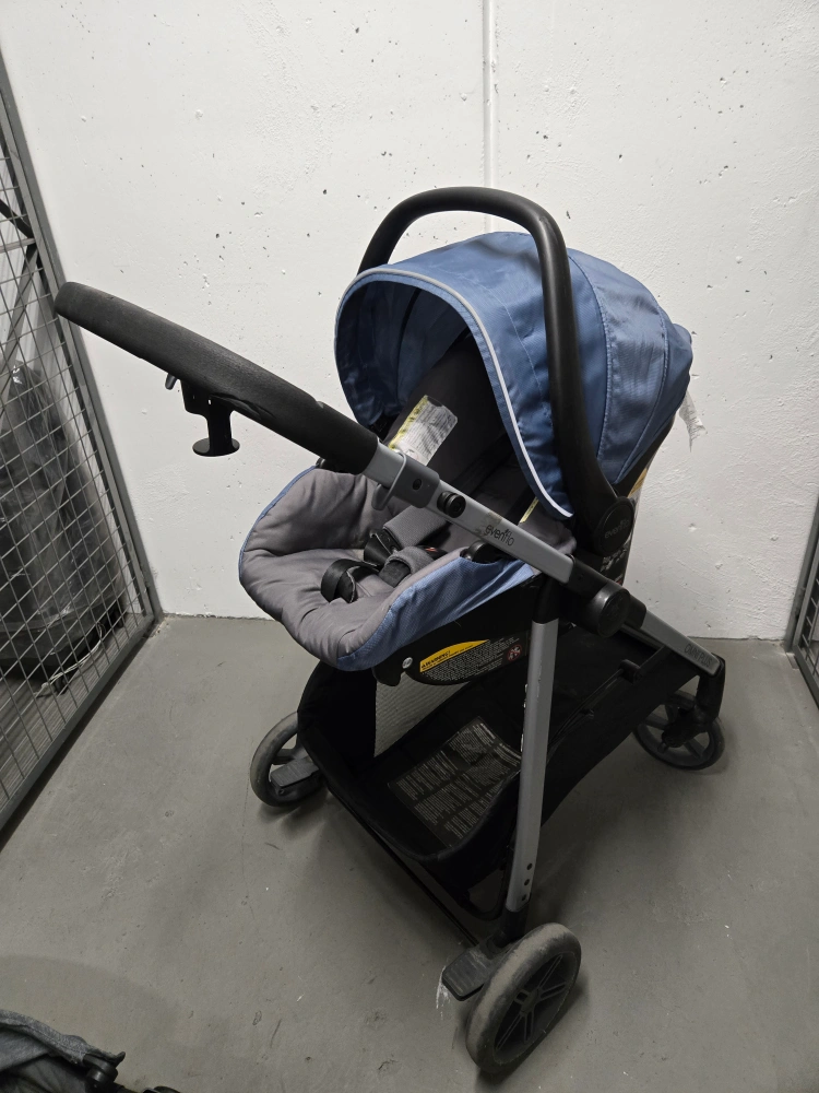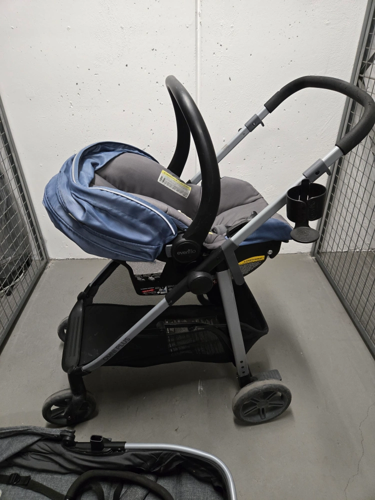 Selling an Evenflo Omni Plus Modular Travel System! The set includes a stroller and a car seat. The stroller is grey and black, and the car seat is blue and grey. Pickup at Yonge-Yonge-Eglinton area.