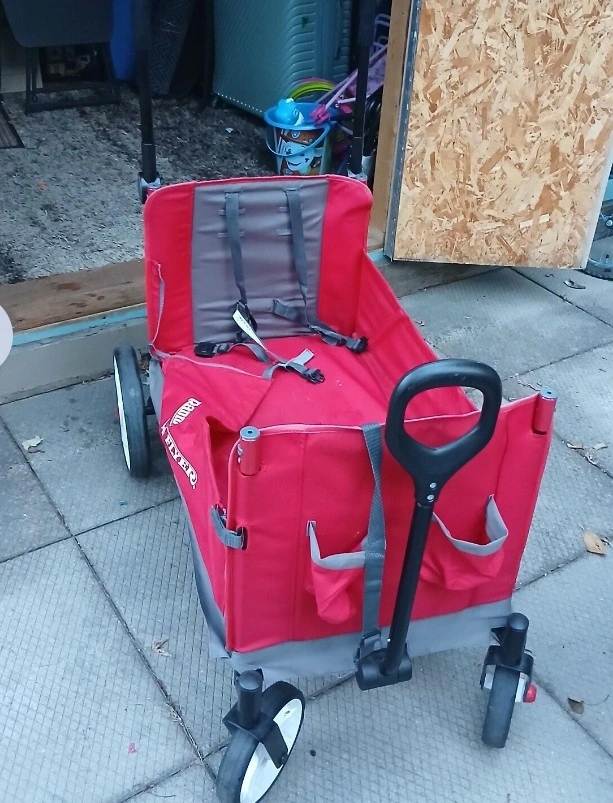 Selling an Evenflo stroller in a stylish grey and black colour scheme! It's in great shape and ready for new adventures with your little one. Perfect for walks around the neighbourhood or trips to the park. It features a convenient cup holder and a storage basket underneath Gray Evenflo stroller with cup holder.$60 Flyer red wagon - $30 pick up only