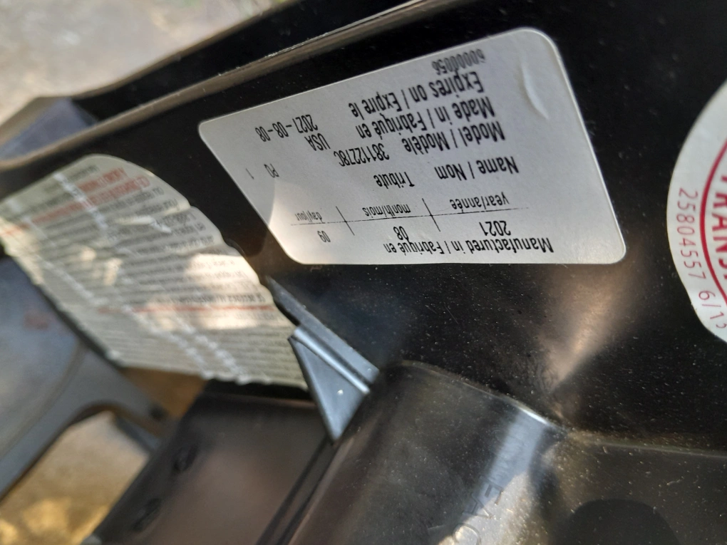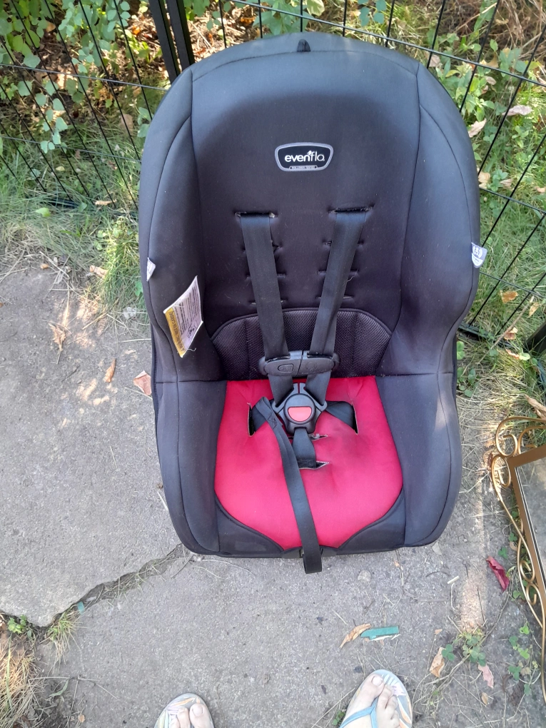 Selling an Evenflo Tribute car seat in black and red. Manufactured in 2021 August 09 and expires 2027 August 08.