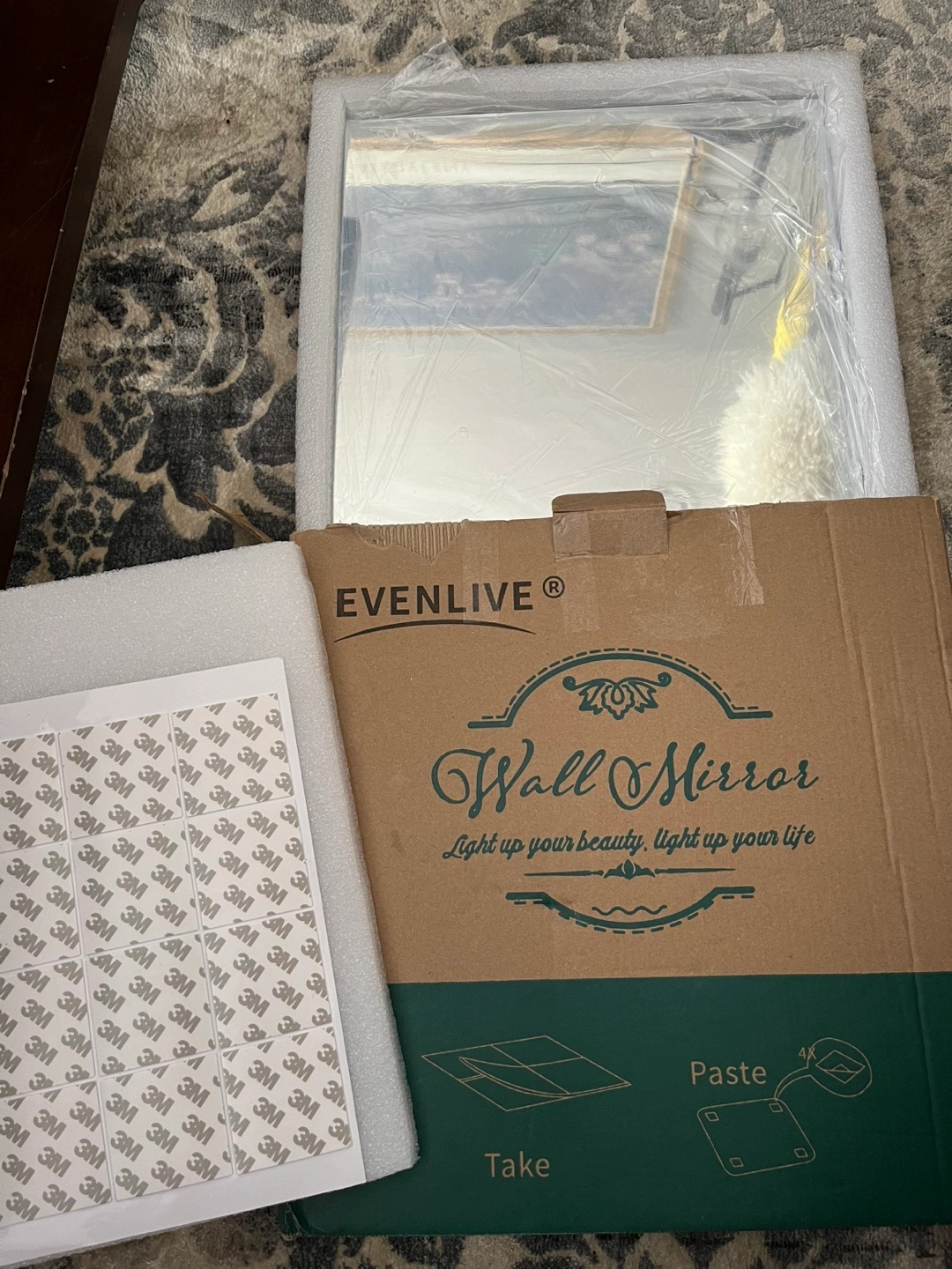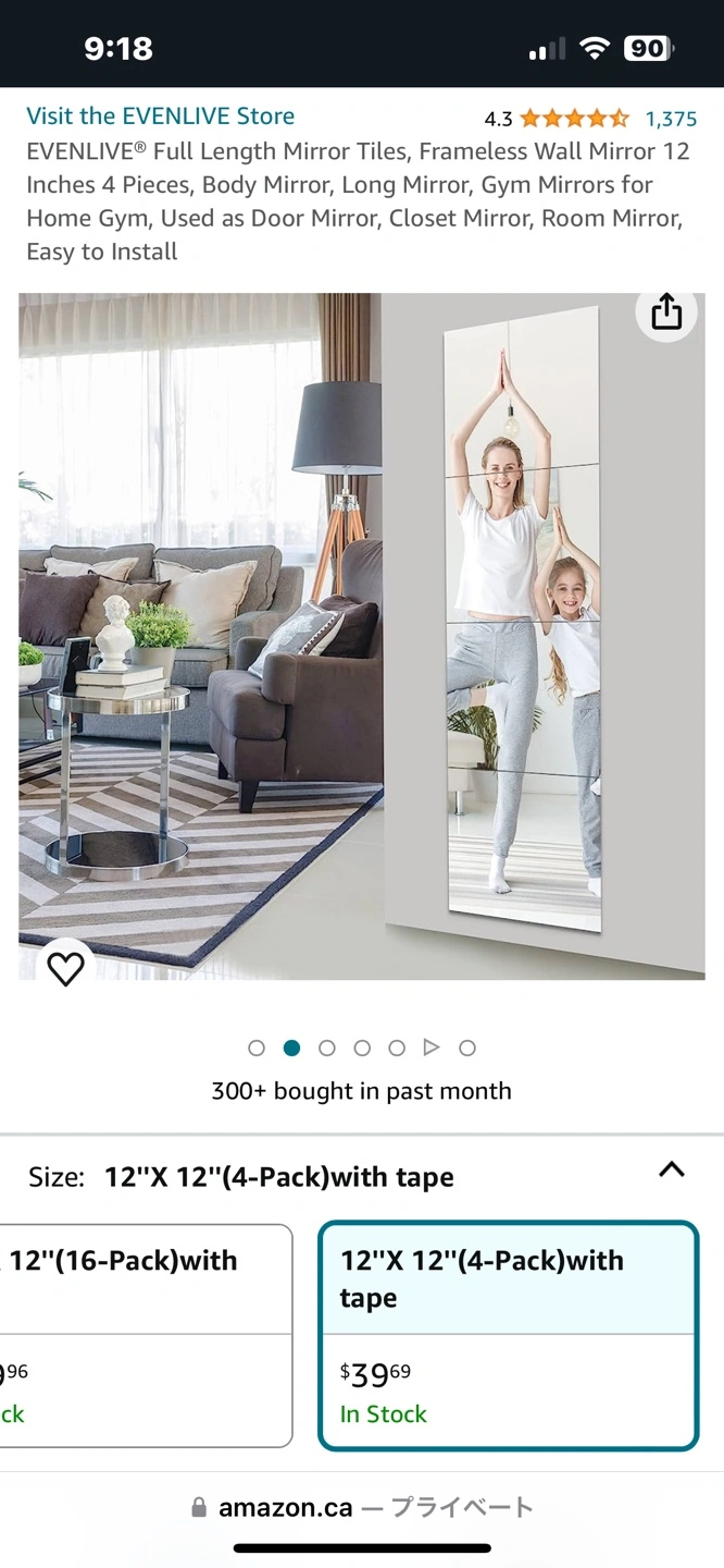 Frameless wall mirror. Four twelve-inch tiles. Easy installation. Great for gyms, closets, or rooms. Includes adhesive.