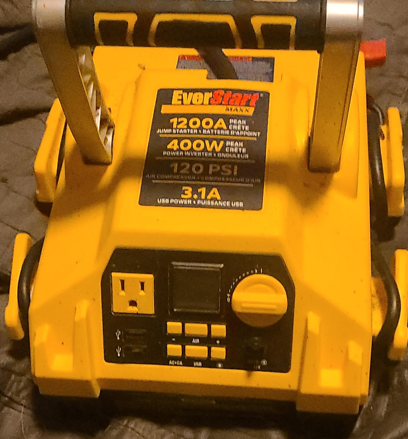 Selling an EverStart Maxx 1200A jump starter. It also has a 400W power inverter, a 120 PSI air compressor, and a 3.1A USB power output. Great for emergencies or when you need a little extra power on the go!