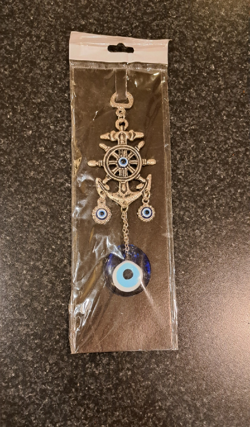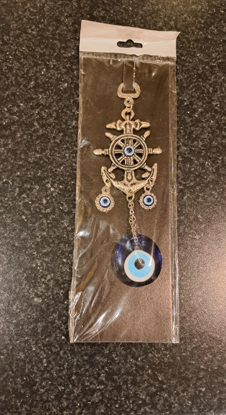 This is a silver-tone evil eye anchor amulet still in its original packaging! It features a ship's wheel, anchor, and evil eye charms. Perfect for adding a nautical touch to your space or as a protective talisman