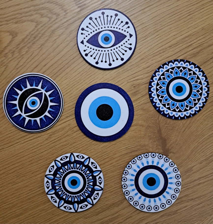 Set of six wooden evil eye coasters. Size: 4" If this post is still up, it means the item is available.