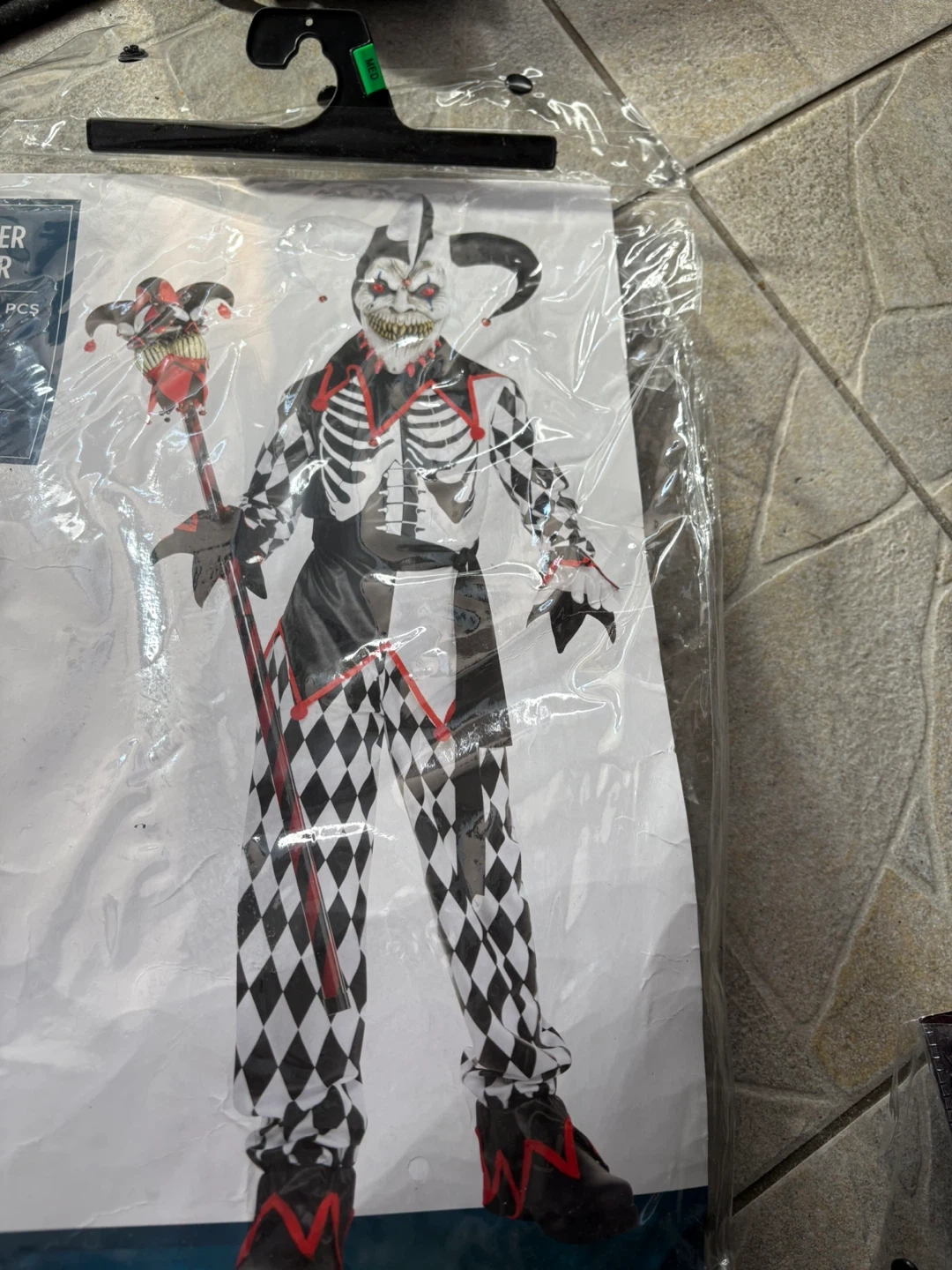 Selling an Evil Jester costume, size medium. It includes the mask, top, pants, and staff. Perfect for Halloween!