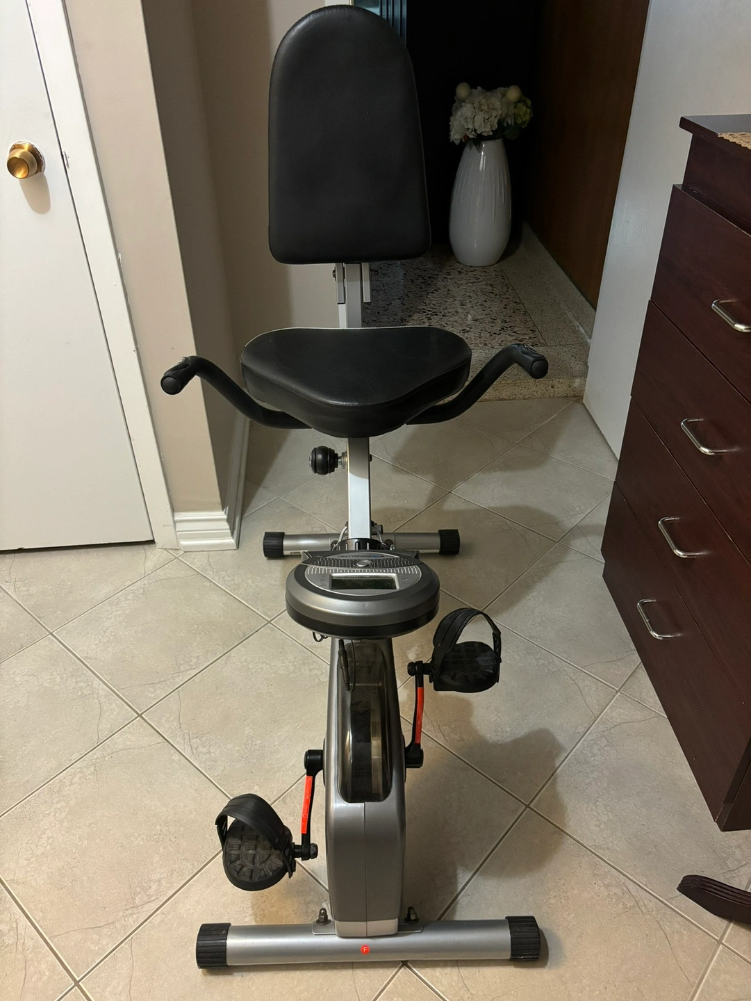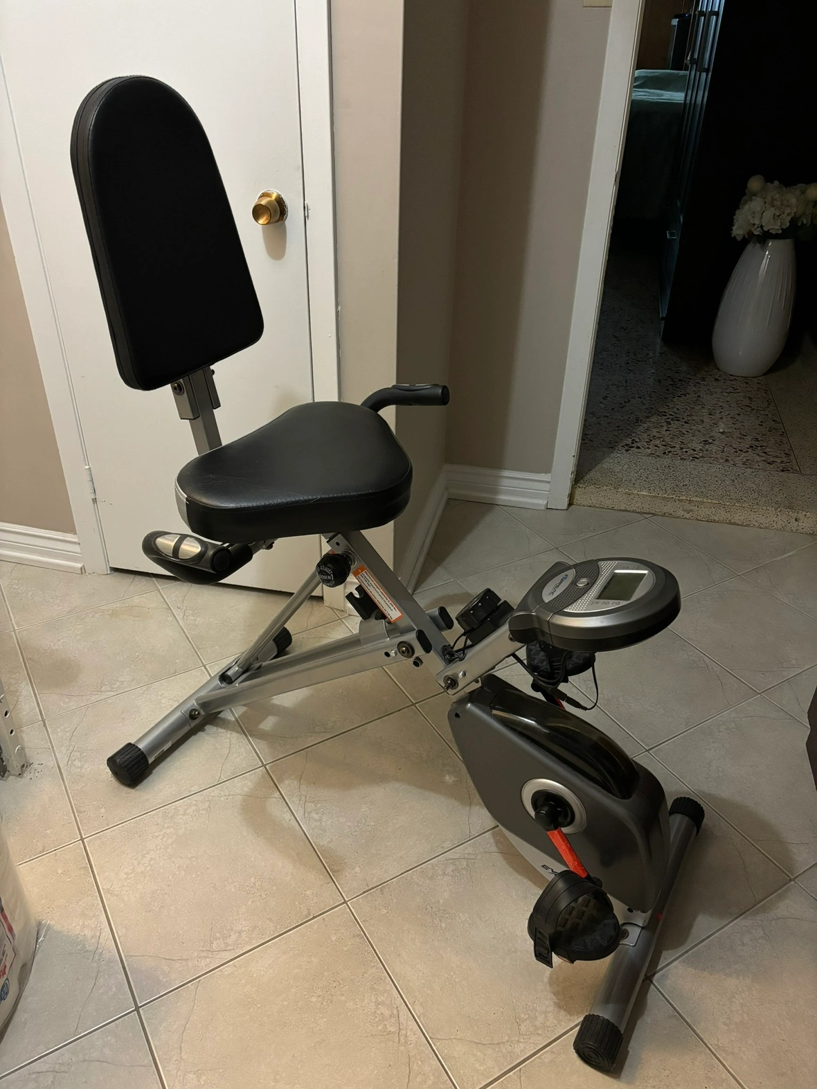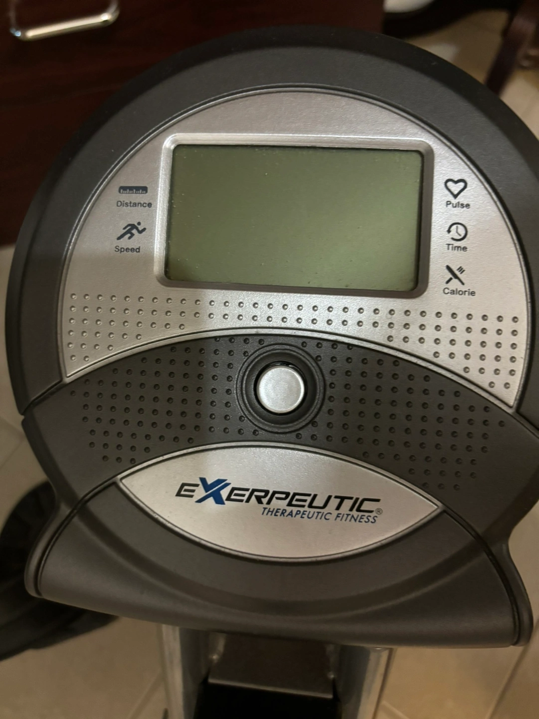 This is a recumbent exercise bike by Exerpeutic Therapeutic Fitness. It has a comfortable seat and arm rests. It features a digital display showing distance, speed, time, pulse, and calories burned.