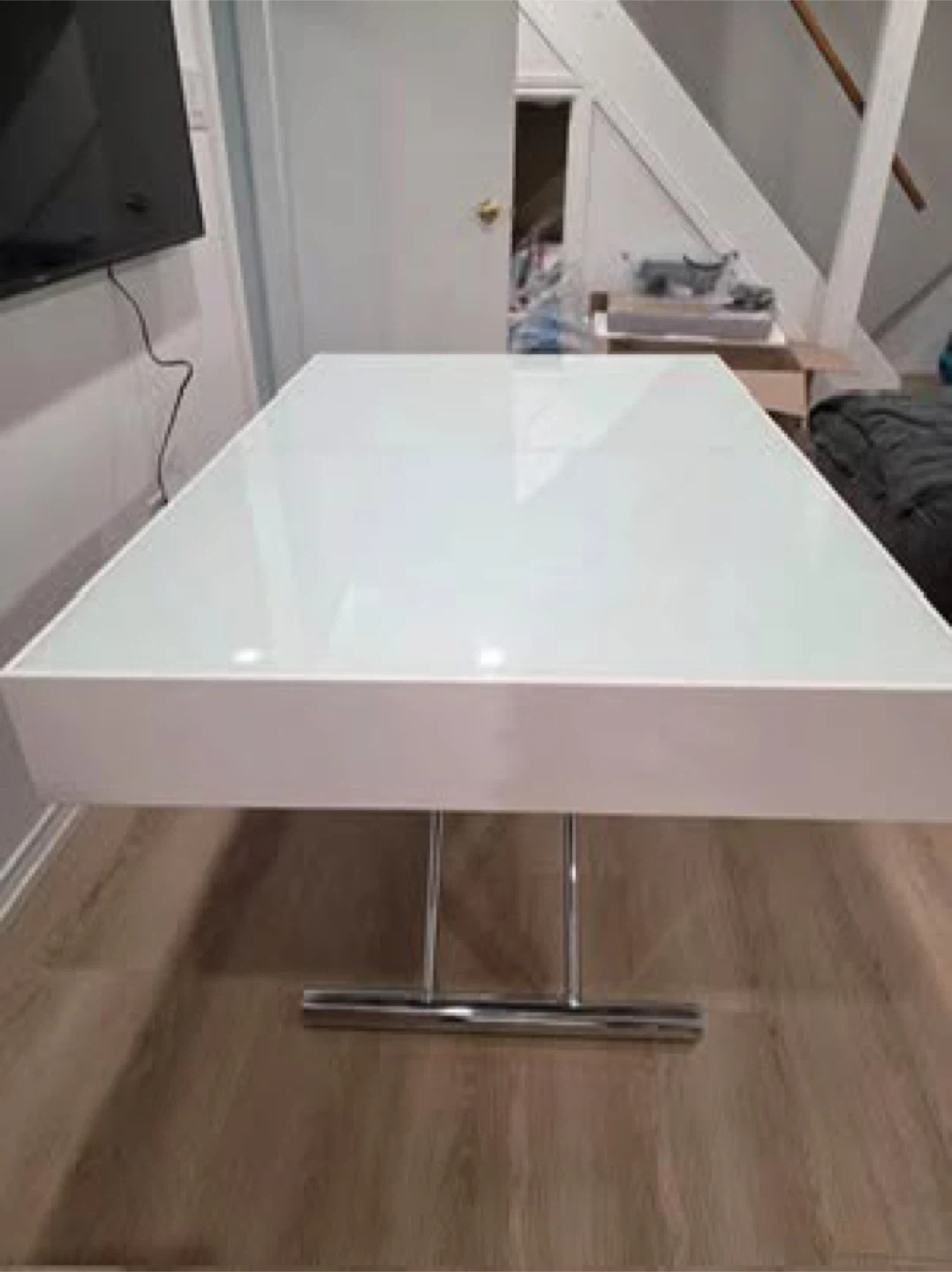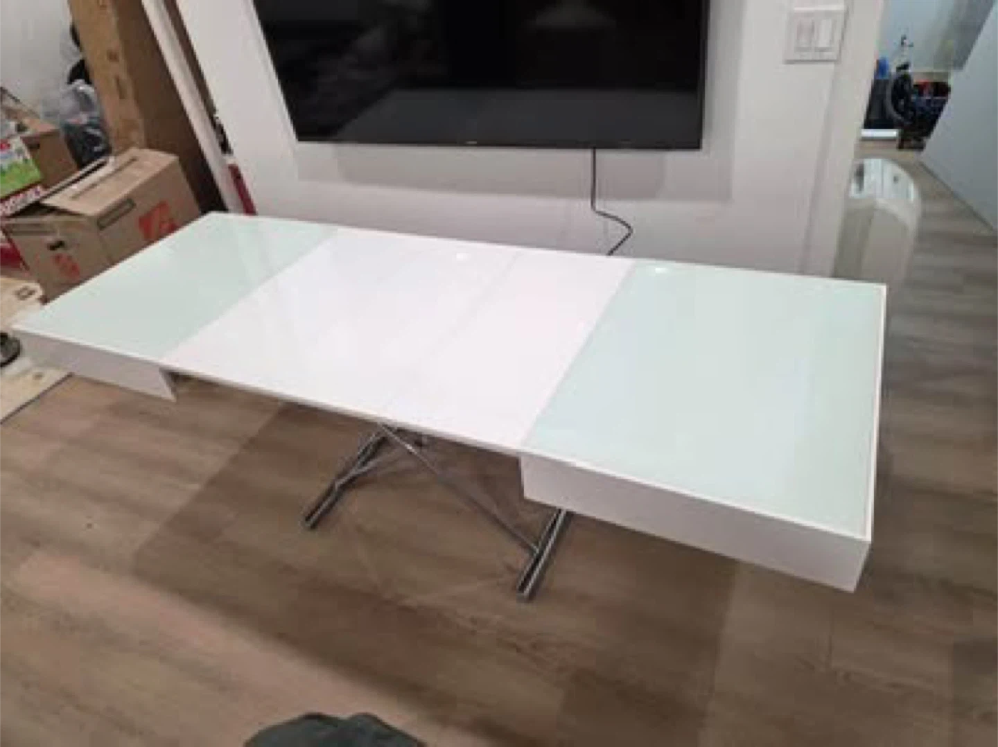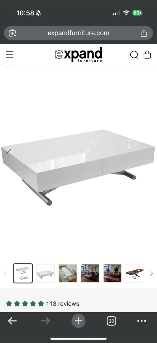 This Expand Furniture Box Coffee to Dining Table is in great condition and ready for a new home! The finish is a glossy white, and it easily converts from a coffee table to a dining table. Originally bought for $2200.00