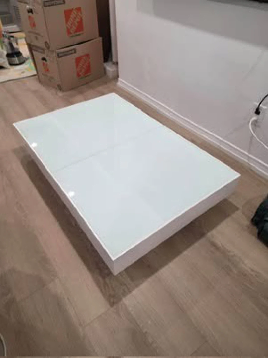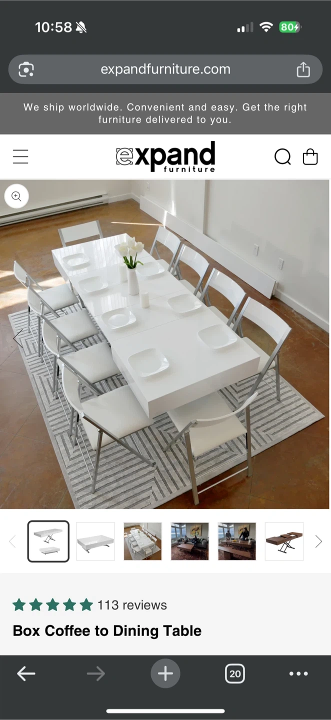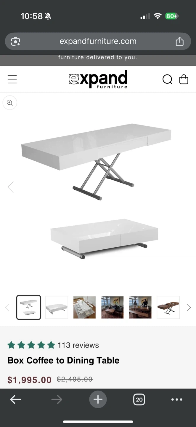 This Expand Furniture Box Coffee to Dining Table is in great condition and ready for a new home! The finish is a glossy white, and it easily converts from a coffee table to a dining table. Originally bought for $2200.00