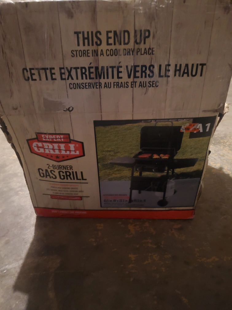 Selling a brand new Expert Grill 2-Burner Gas Grill, still in its original box! This grill features: - 14-burger cooking capacity - Porcelain cooking grates - 375 square inch total cooking area - 19,000 BTUs cooking heat Dimensions: 43.5 in (W) x 22.3 in (D) x 41.5 in (H) Perfect for your backyard BBQs!