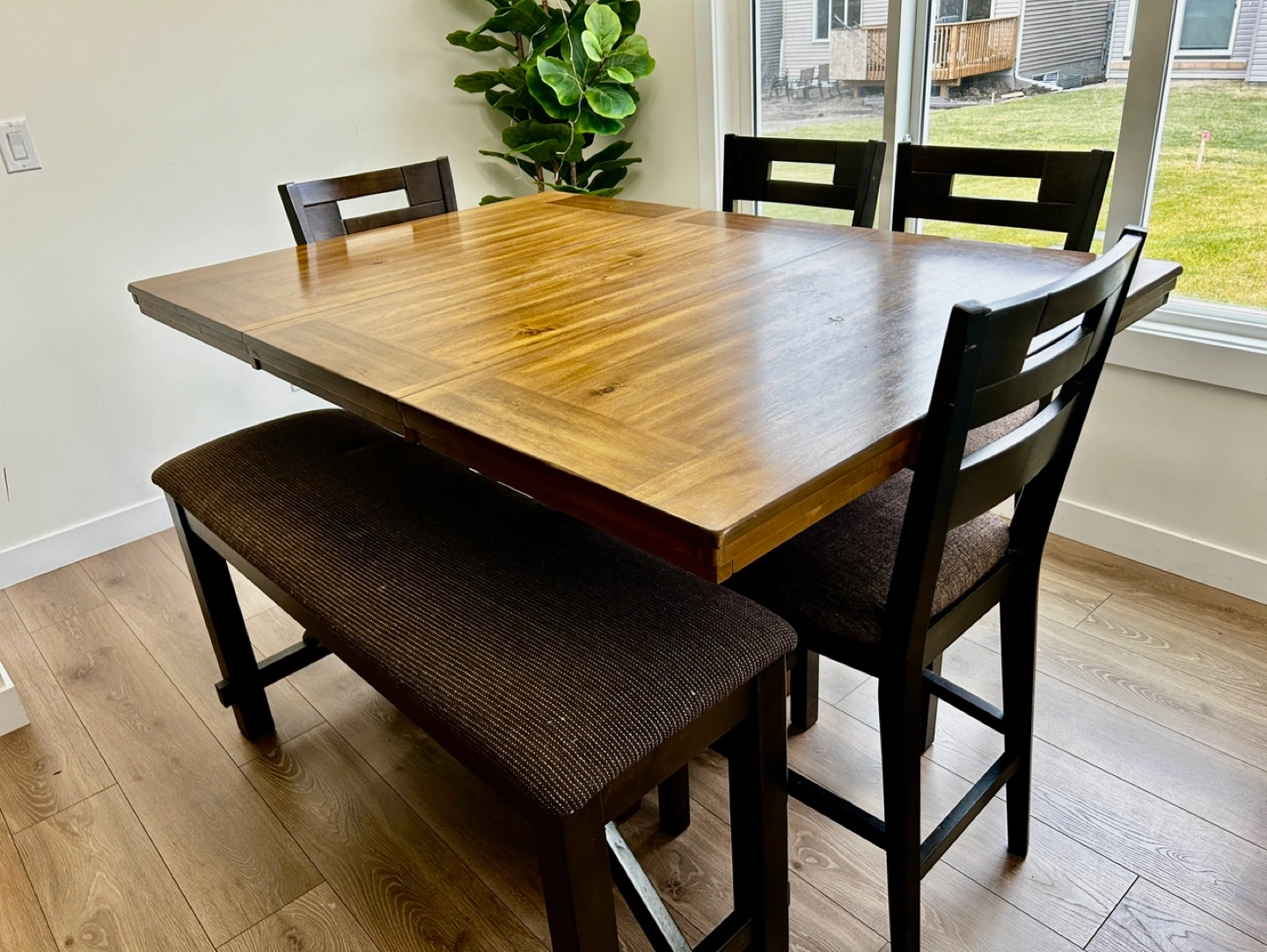 Table with four chairs and a bench. Table extends to accommodate more guests. Dark brown chairs with brown seats. Bench is upholstered in a dark brown fabric. The space saving dining tables with bench and four chairs can expand to different length, perfect for those who want a small table most of the time and a large dining table for special occasions.