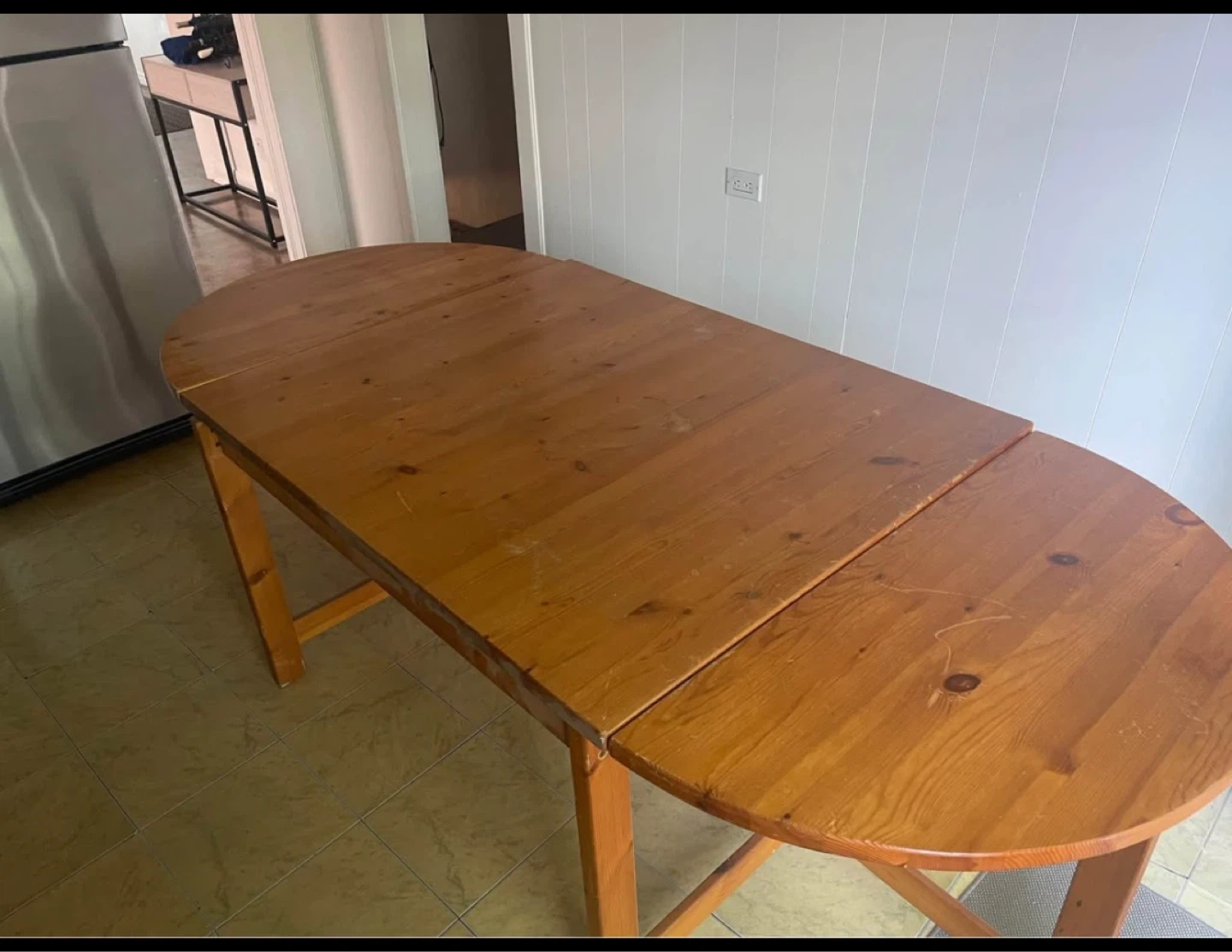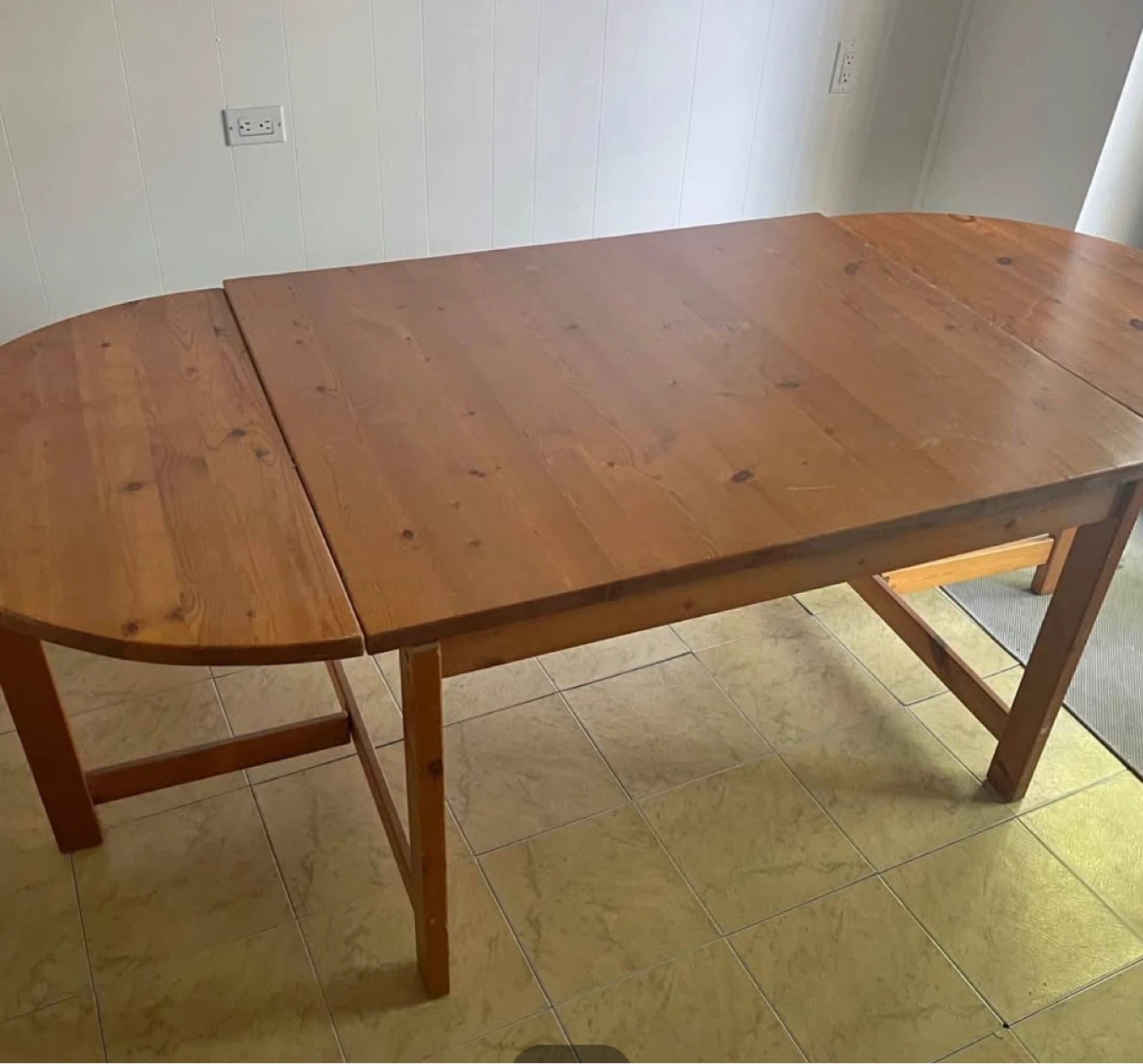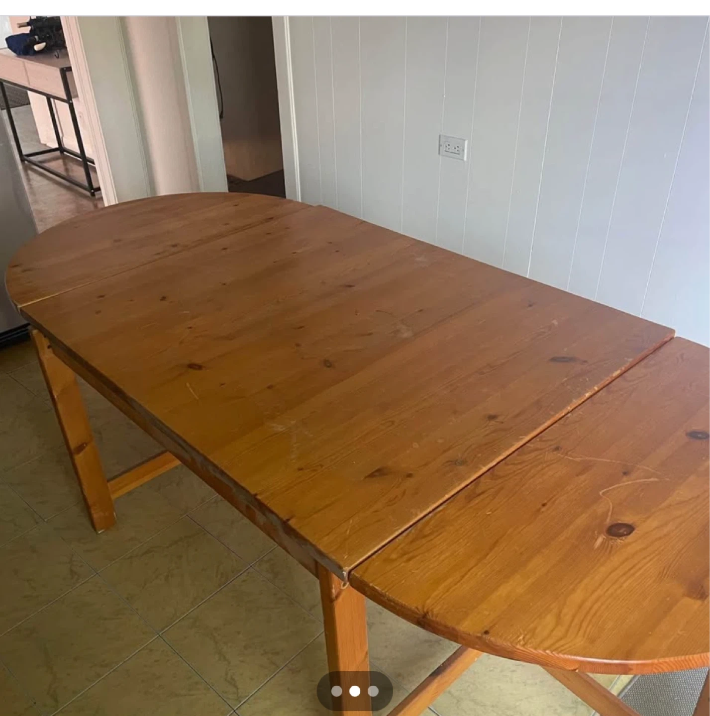 Selling a wooden dining table with an extendable leaf. It's perfect for accommodating extra guests! The table is in good condition and has a warm, natural wood finish. It has some signs of wear, but it's still sturdy and functional. A great addition to any dining space! I bought it as a diy project and started sanding but nothing a tablecloth can’t fix