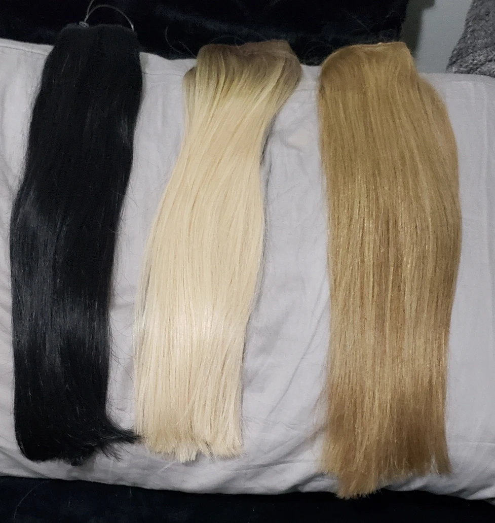 Selling three sets of hair extensions in black, blonde, and light brown colours. They are new 18inches 100grams and 100% real chinese hair