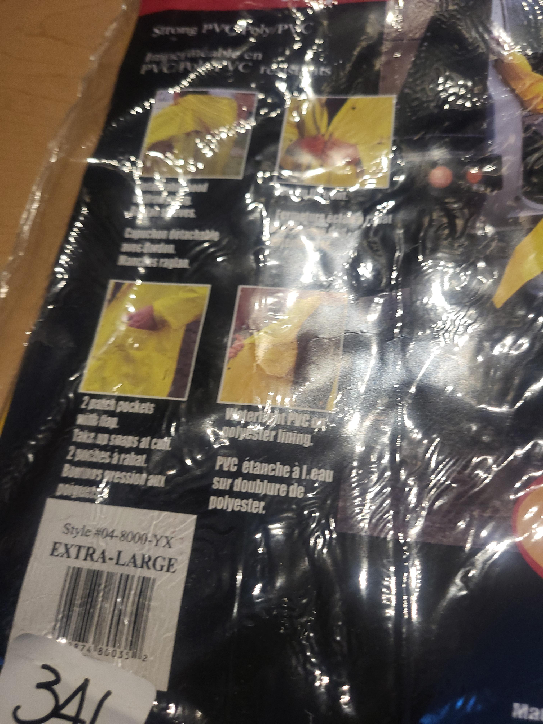 Selling an extra-large raincoat, style #04-8000-YX. It features a detachable hood and raglan sleeves. There are also two patch pockets with flaps and take-up snaps at the cuffs. The raincoat is made of waterproof PVC with a polyester lining