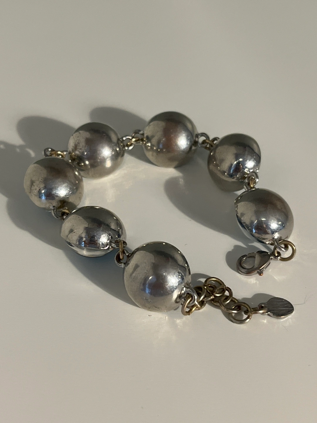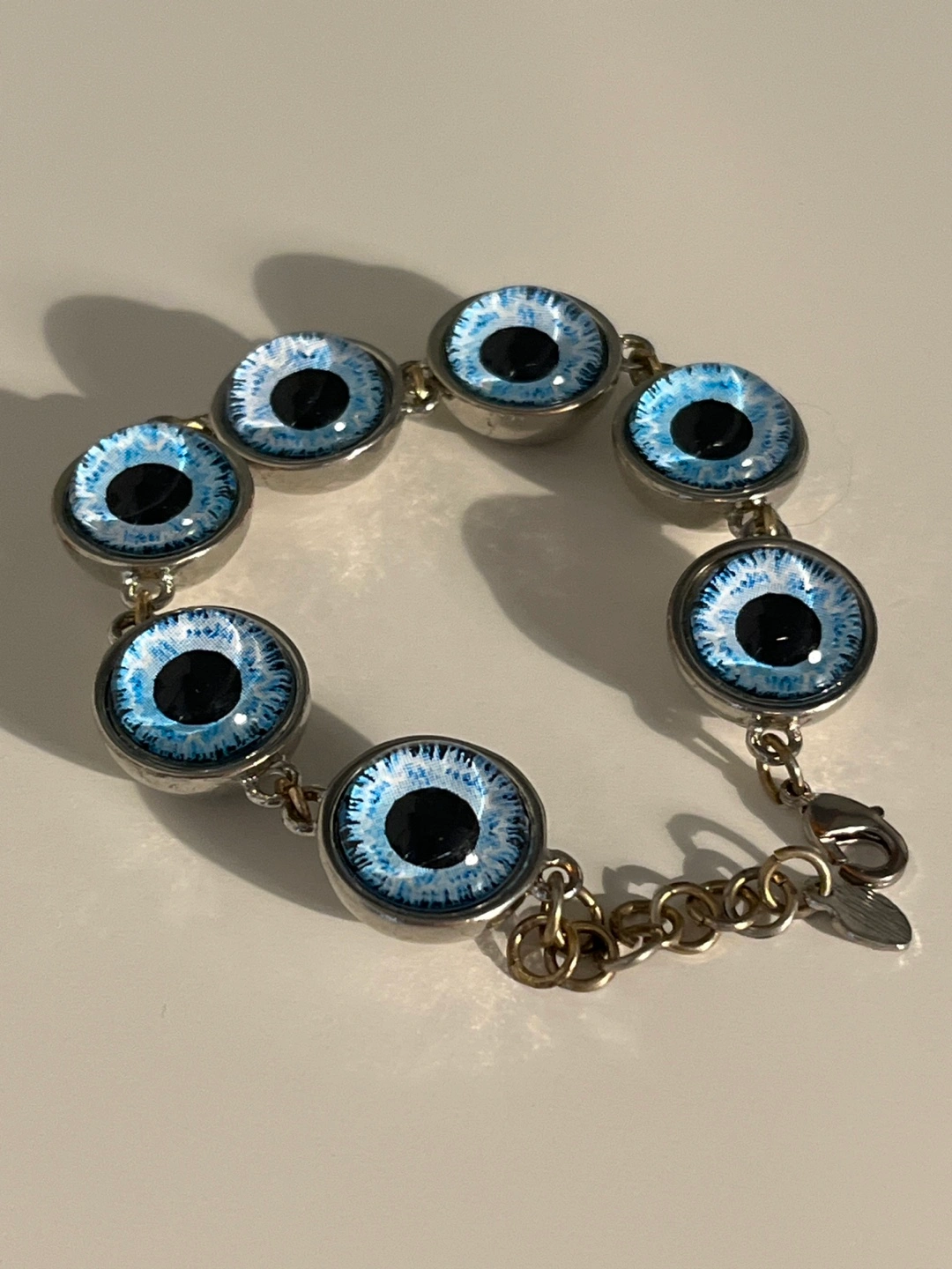 Silver tone bracelet with blue eye charms. Has a lobster clasp and a heart charm.