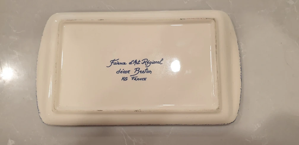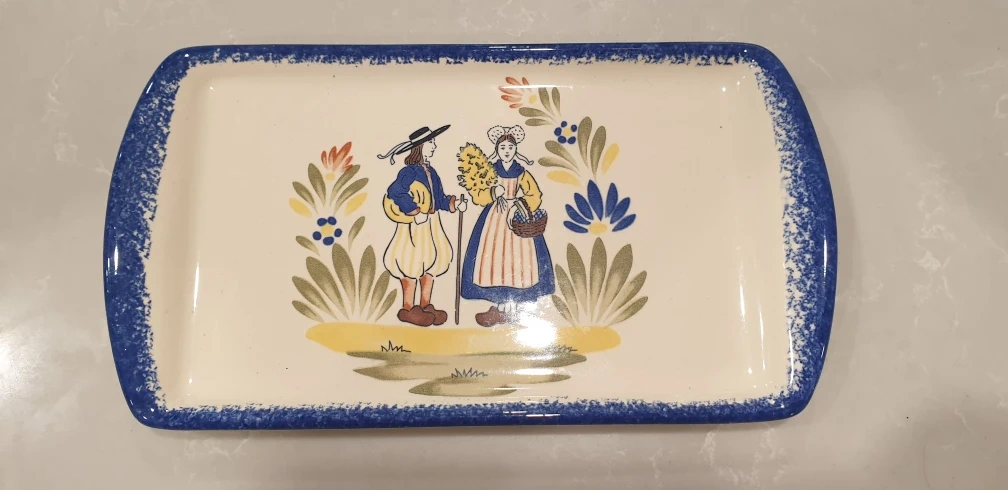 Selling a lovely Faïence d'Art Régional Décor Breton tray! This unique piece features a charming design with traditional figures and floral accents. It's marked "KG FRANCE" on the bottom.
