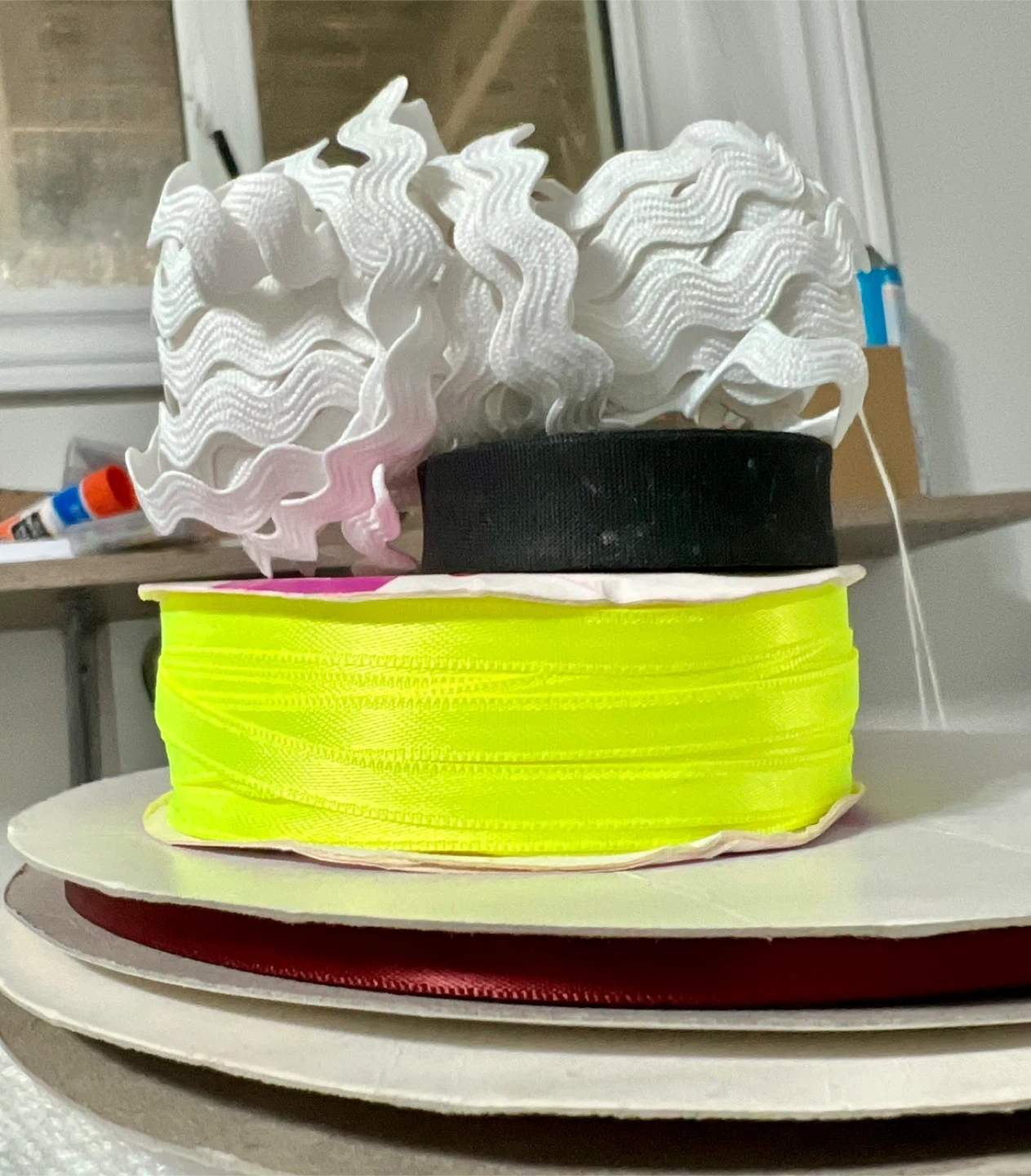 A mixed lot of fabric pieces and ribbon rolls, perfect for sewing and craft projects! The fabrics include various patterns, such as a Toronto Maple Leafs print, forest animals, and solid colors. The ribbons come in a variety of colours and styles, including striped and polka-dotted options. Great for adding details to your creations!