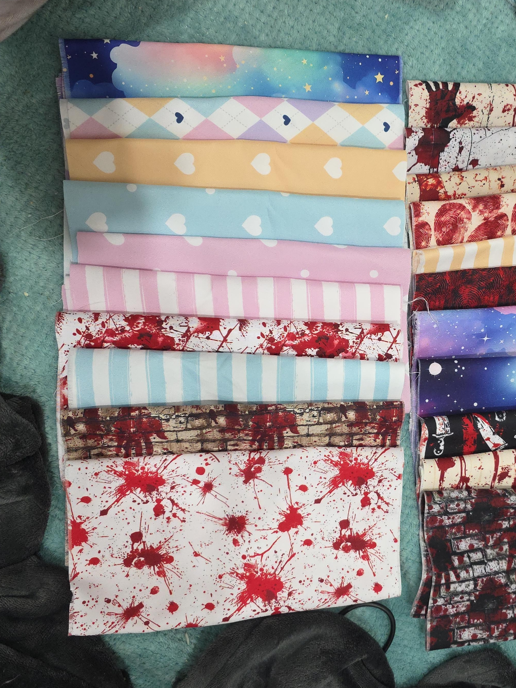 Selling a collection of fabric scraps with various patterns. Great for crafting, quilting, or small sewing projects! There's a mix of colourful and unique designs to choose from.