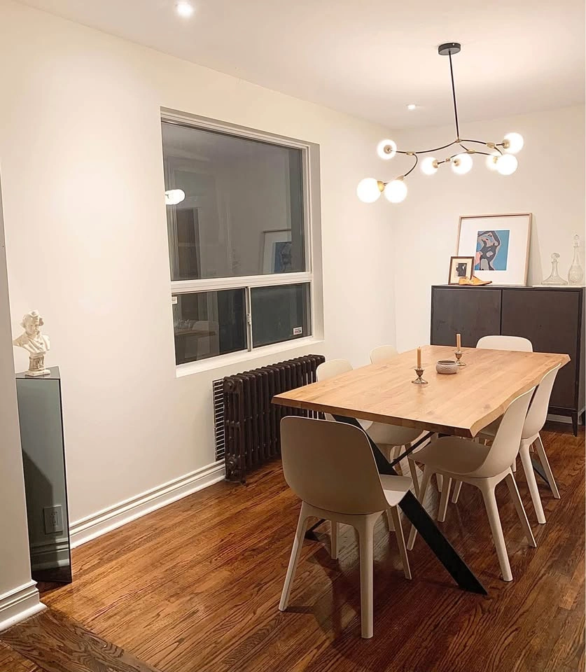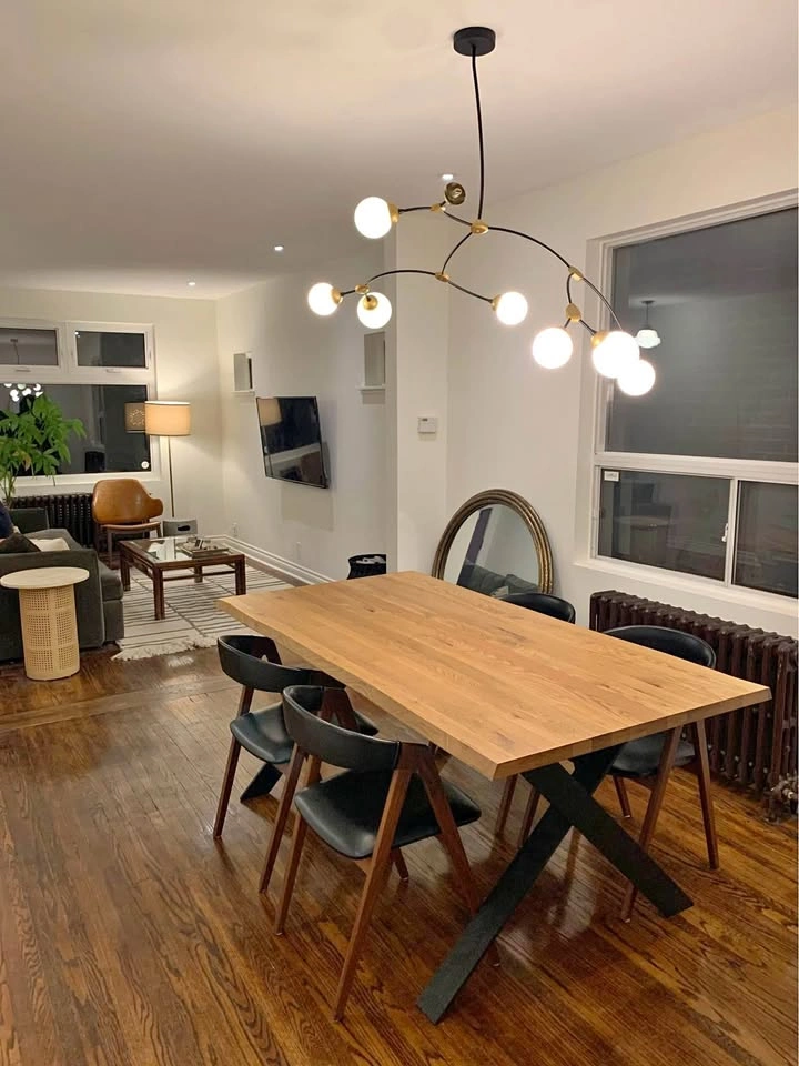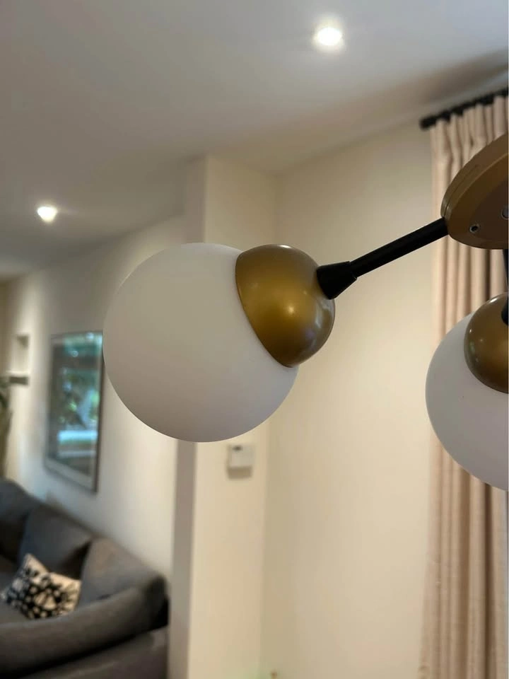 51”w x 37” h Globes are all matte frosted white (looks more luxe when it’s not in use) Gives off a ton of light Not dimmable