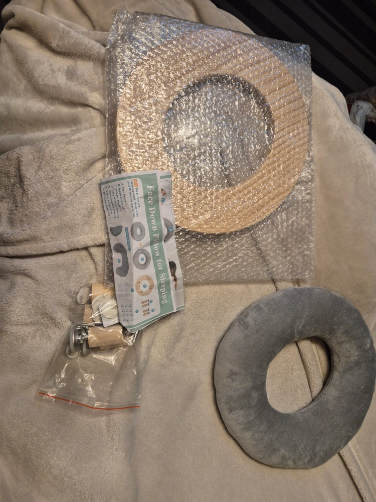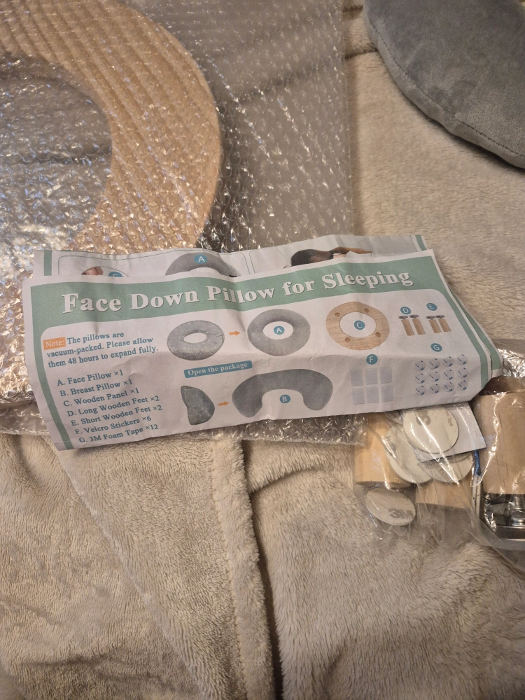 This face down pillow is designed for sleeping. It comes with multiple components: - Face Pillow x1 - Breast Pillow x1 - Wooden Panel x1 - Long Wooden Feet x2 - Short Wooden Feet x2 - Velcro Stickers x6 - 3M Foam Tape x12 The pillows are vacuum packed, so please allow them 48 hours to expand fully