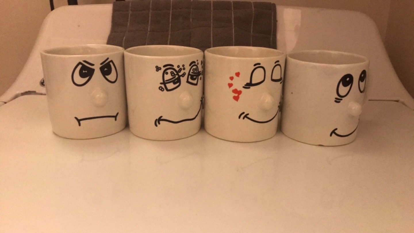 Selling a set of four unique face mugs! Each mug has a different facial expression, adding a bit of fun to your morning coffee or tea. They're in good condition and ready for a new home. Perfect for collectors or anyone who enjoys quirky kitchenware. I also have a matching tea pot. Pick up location is 10 Alcorn Avenue Toronto M4V1E4