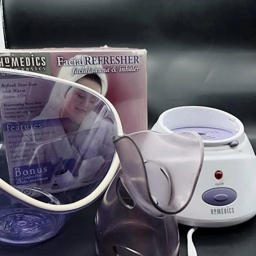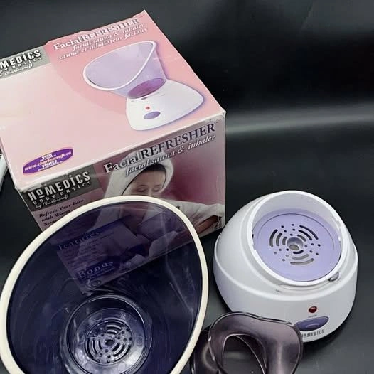 Facial sauna and inhaler that uses warm steam mist to cleanse and refresh your skin, with adjustable steam control and a soft inhaler attachment.