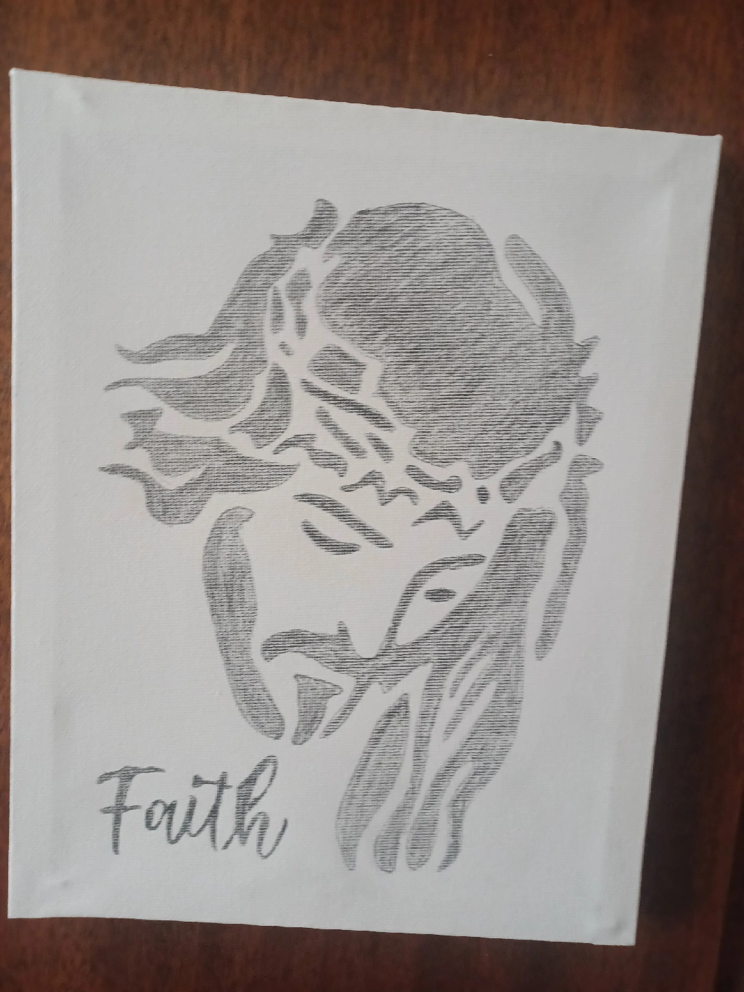 The image shows a face representing Jesus on the cross after he prayed and said "Faith."