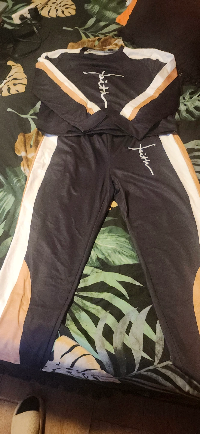 Selling a comfy two-piece tracksuit with a unique design! The set features a long-sleeved top and matching pants in black with white and gold stripes along the sleeves and legs. The word 'faith' is printed in cursive on both the top and the pants. Perfect for lounging or casual outings!