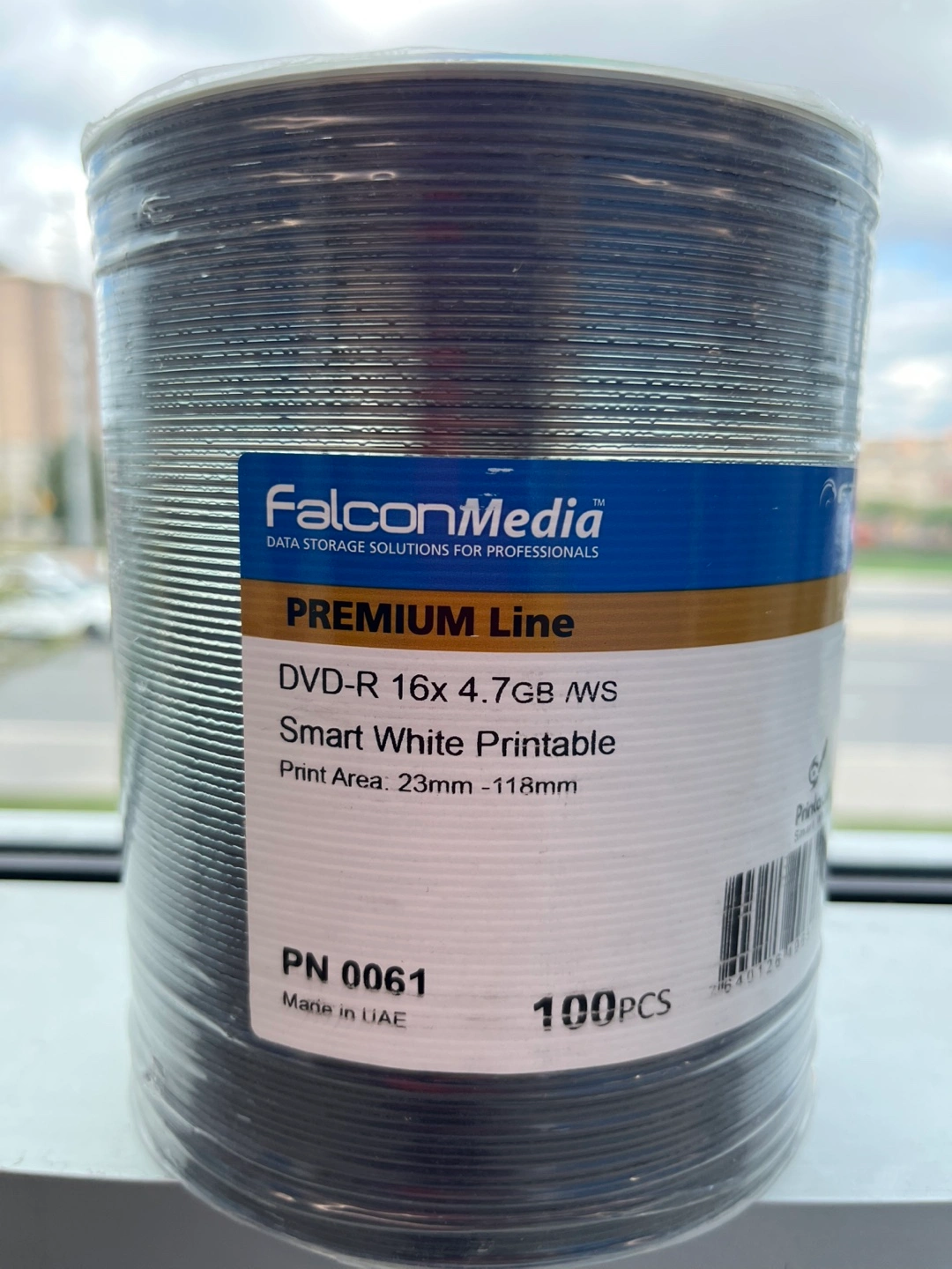 Selling a spindle of FalconMedia Premium Line DVD-R discs. These are 16x speed, 4.7GB capacity, and smart white printable. Each spindle contains 100 discs, perfect for archiving or distributing data. The print area is 23mm - 118mm. There are multiple spindles and partially used spindles available