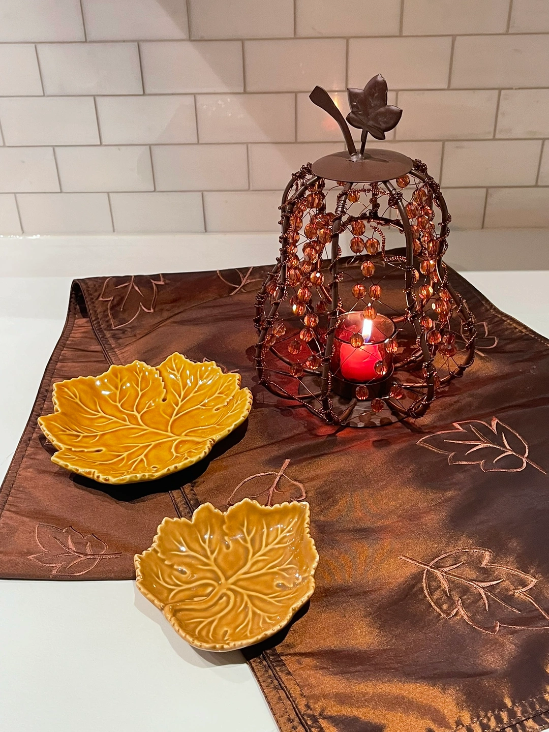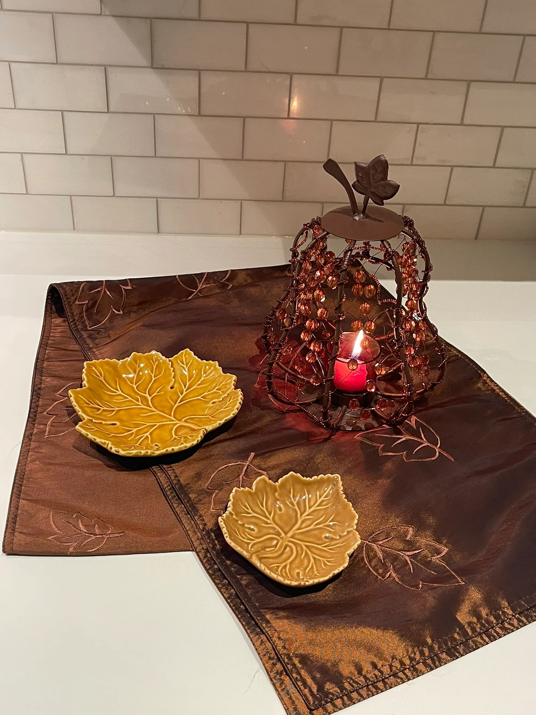 Iron and bead work tea light holder centre piece, 70 inch long table runner and ceramic leaf plates. All items are brand new, plates still have tags on them . Oakville Trafalgar & Dundas