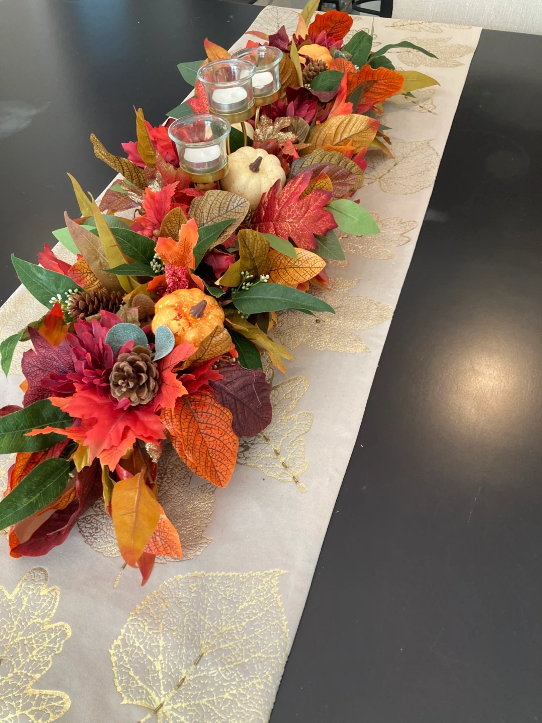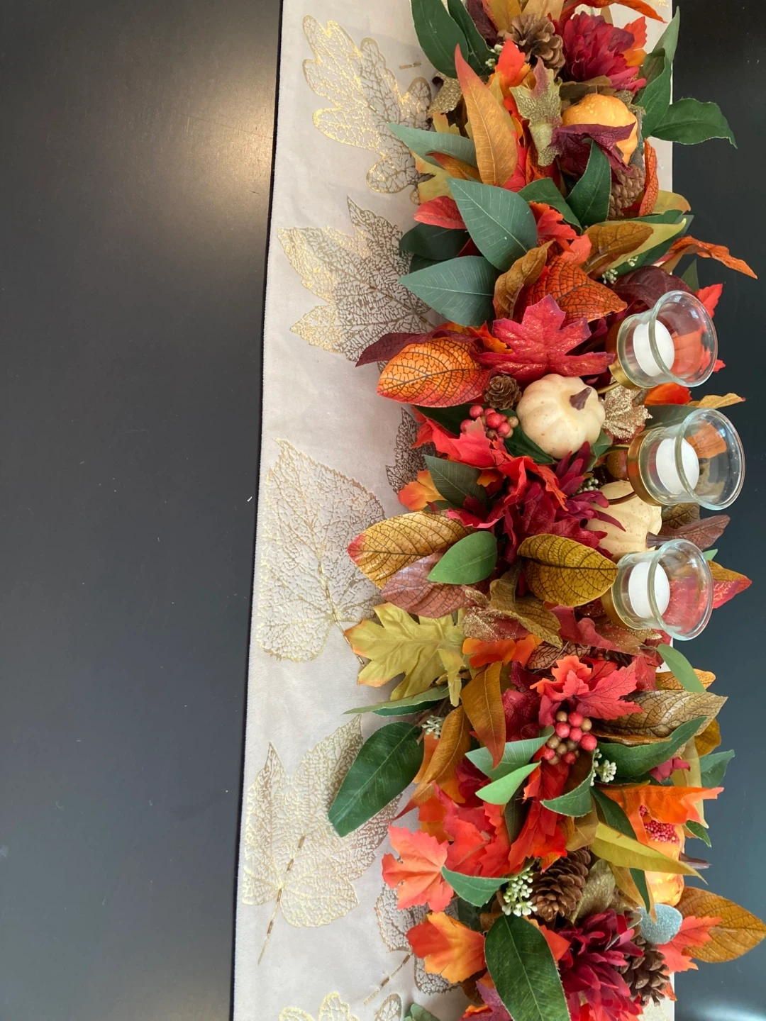Add a touch of autumn charm to your dining table with this lovely fall-themed table runner. It features vibrant artificial leaves in warm reds, oranges, and browns, accented with decorative pumpkins and pine cones. The runner also includes three glass candle holders to create a cozy and inviting atmosphere for your gatherings
