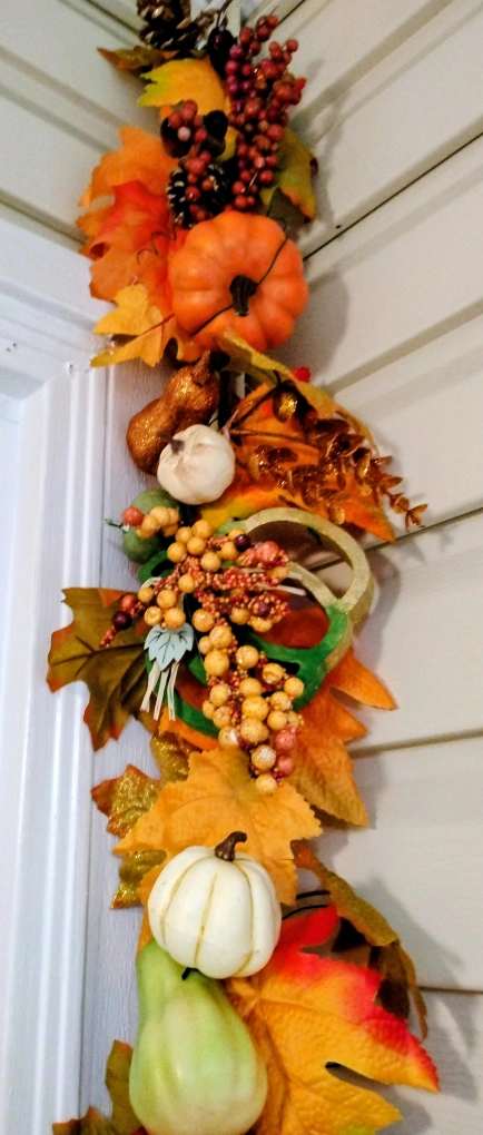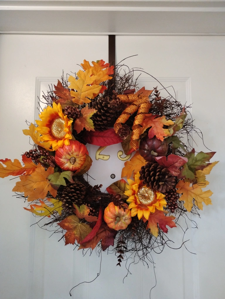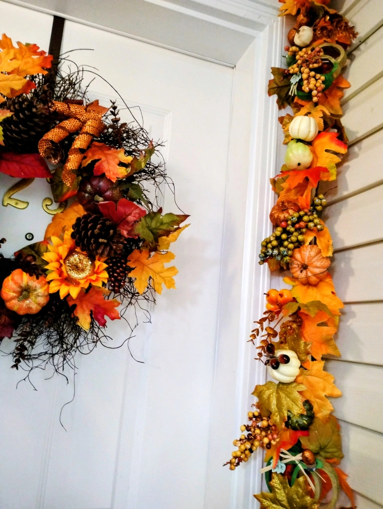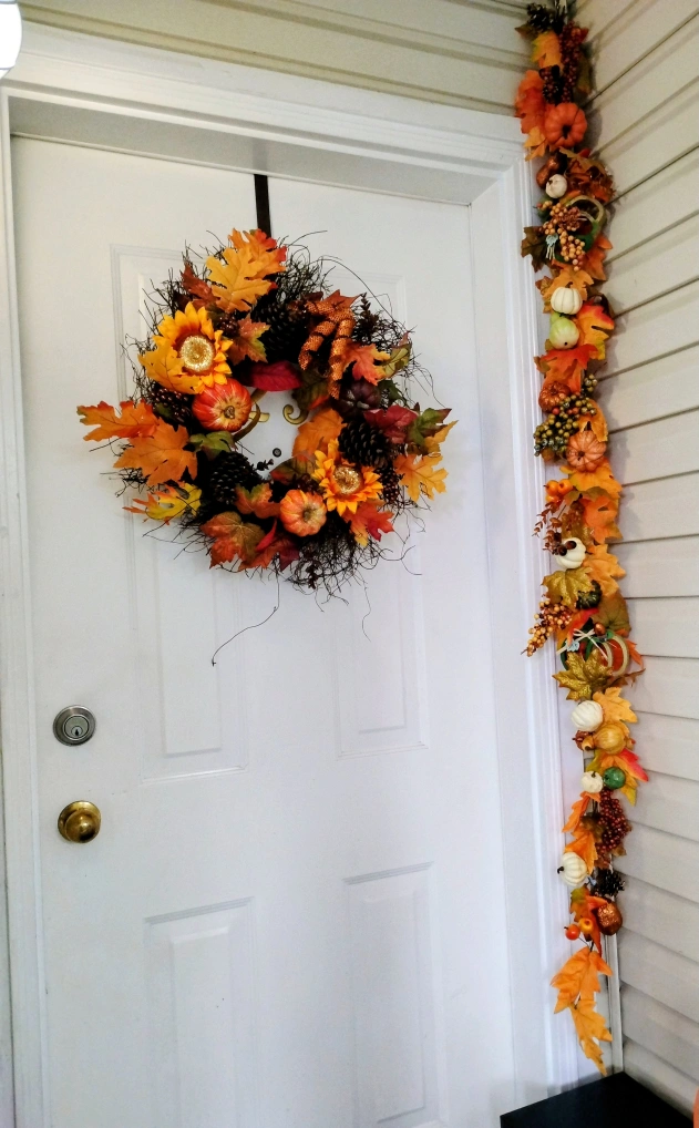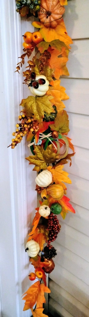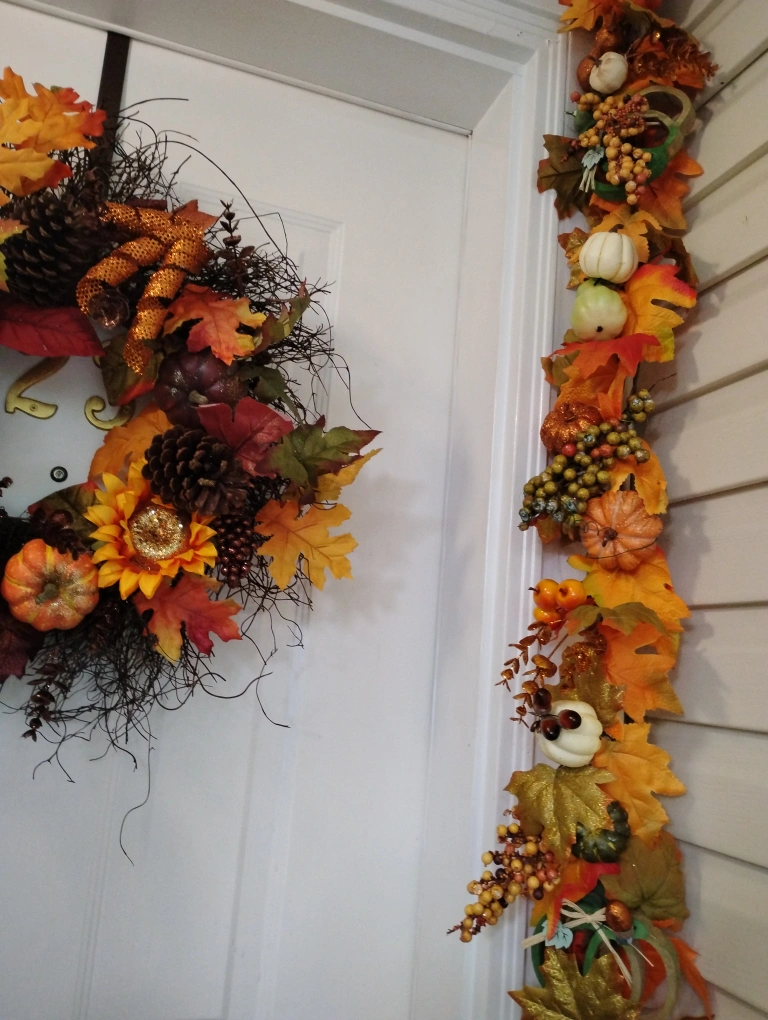 Add some autumn charm to your home with this lovely fall wreath and garland set! The wreath features sunflowers, pinecones, and decorative pumpkins, while the garland is adorned with colourful leaves and gourds. Perfect for your front door or mantelpiece to welcome the season. Will sell separately or as a set, price difference.