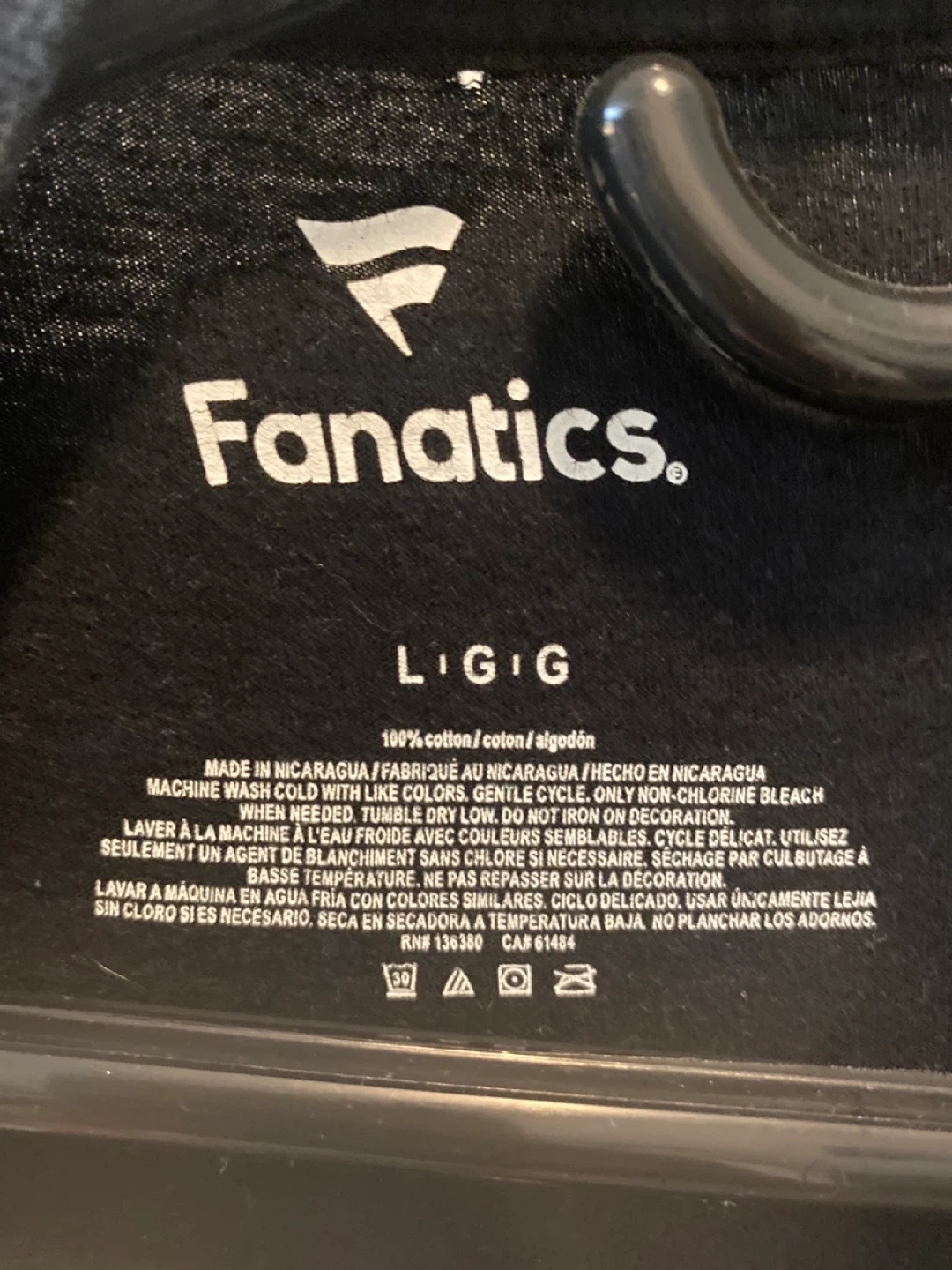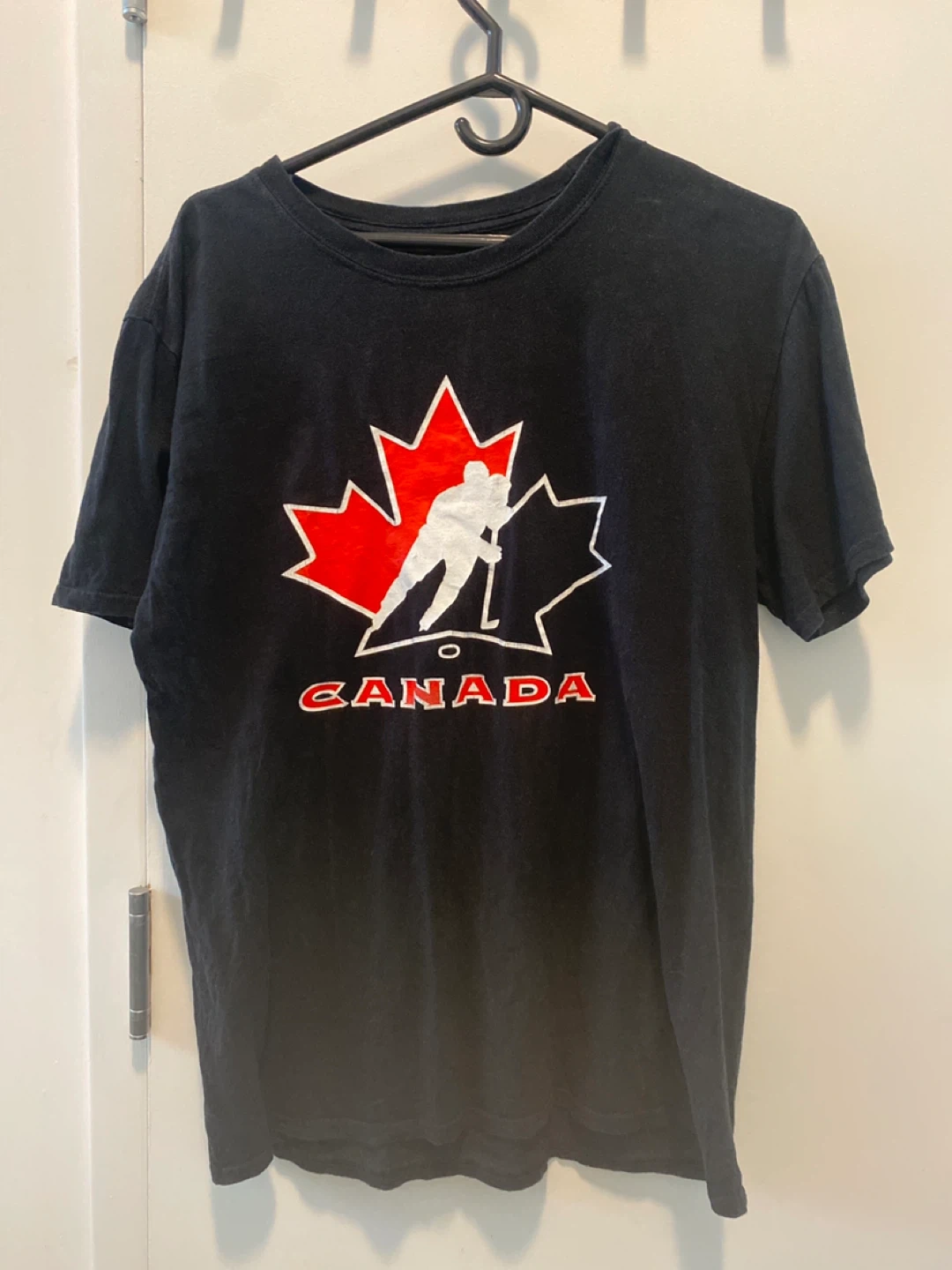 Selling a black Fanatics t-shirt with a Canada hockey design. It's a size large and made of 100% cotton. The shirt features the Canadian maple leaf with a hockey player silhouette. Machine washable for easy care!