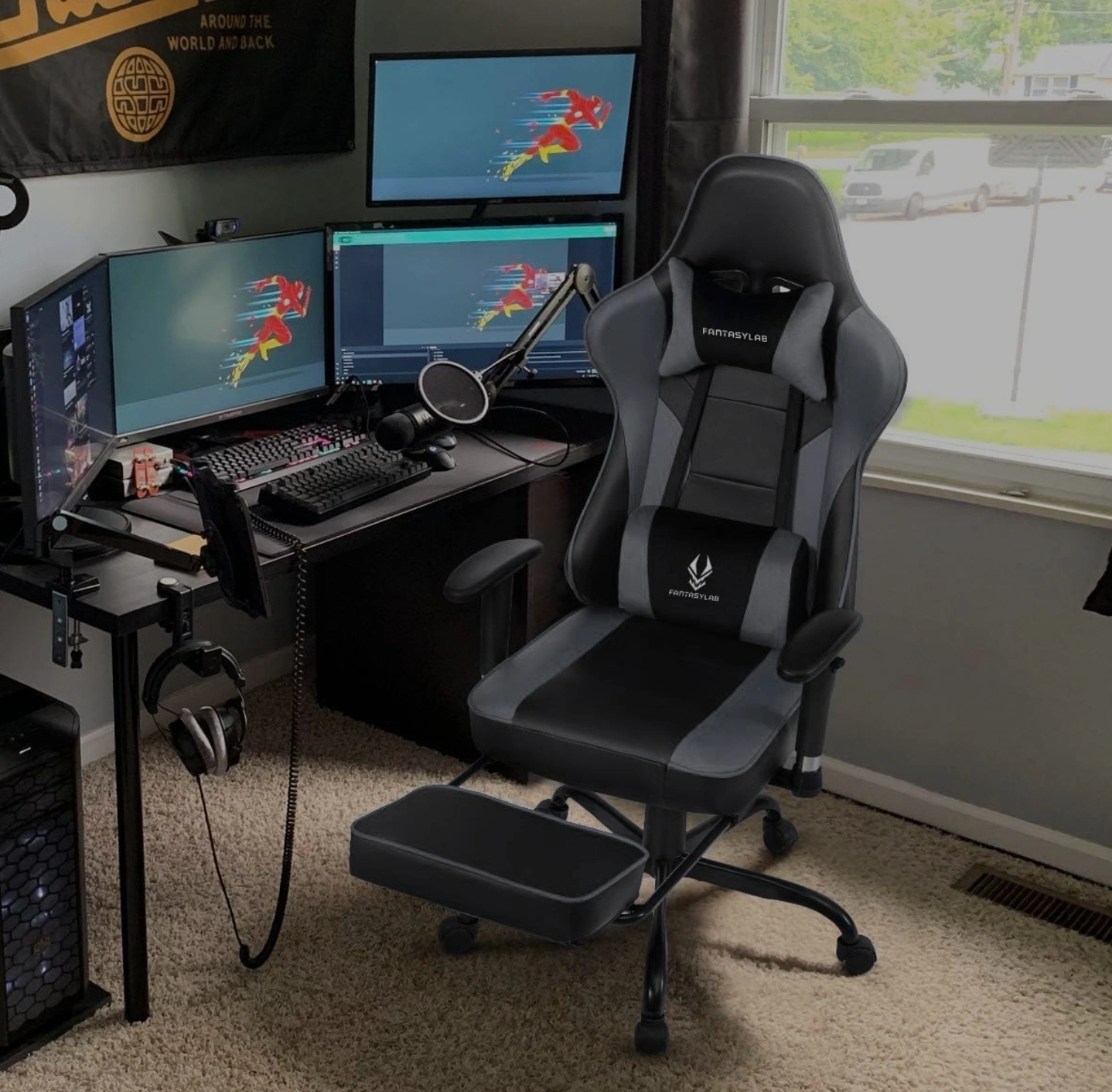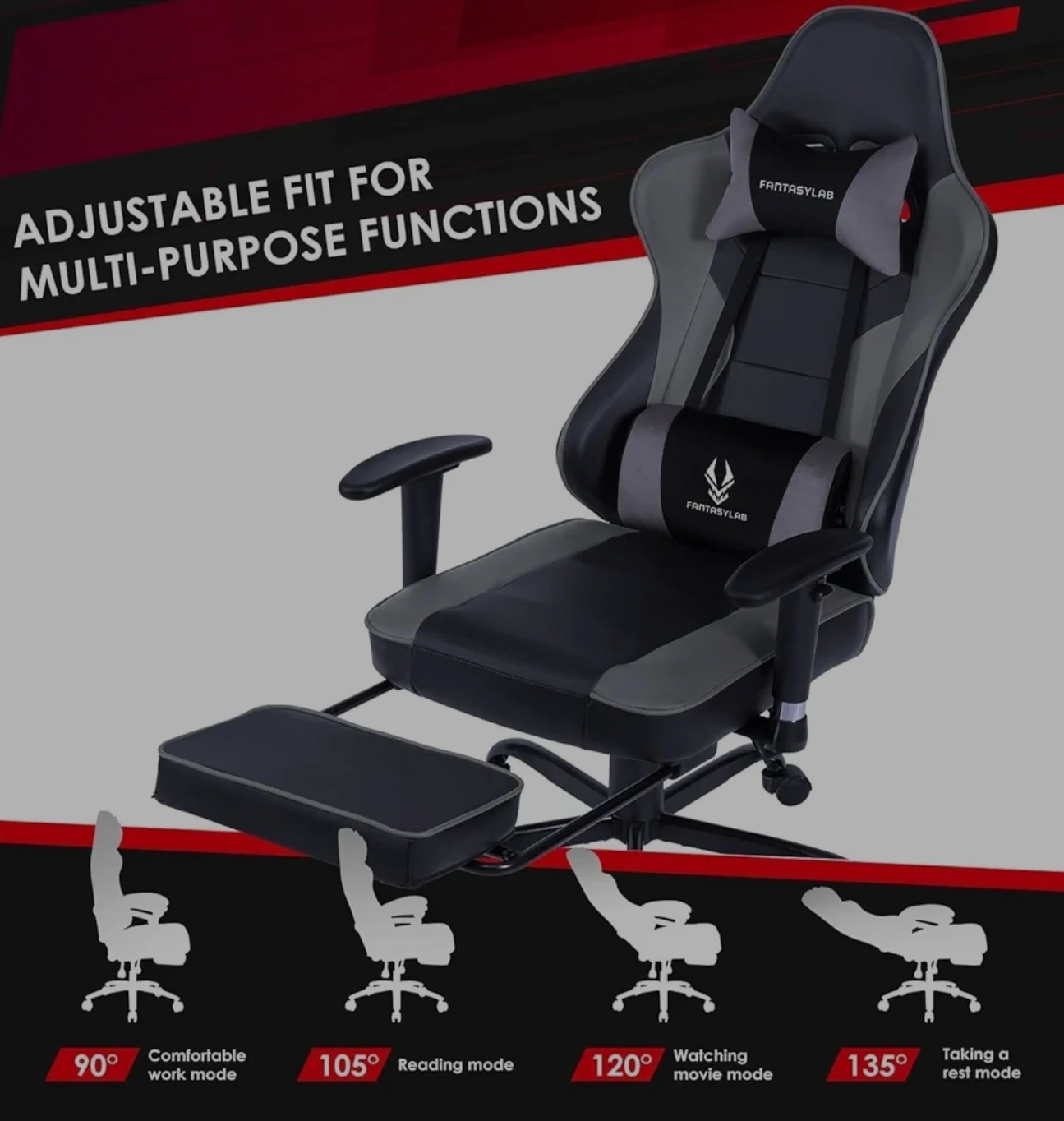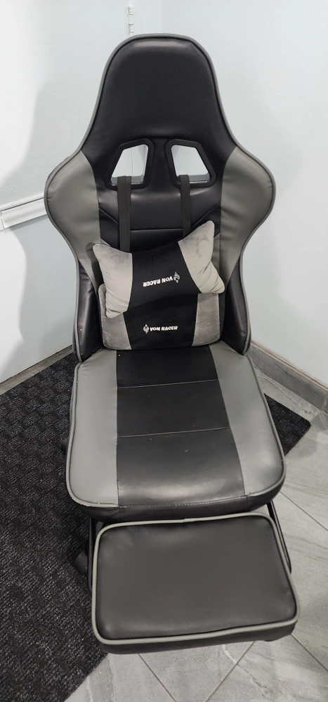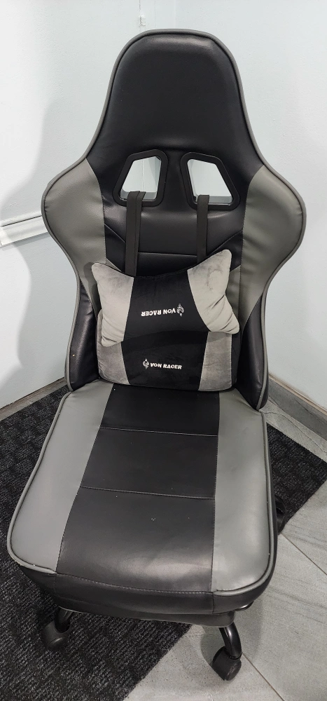 FANTASYLAB gaming chair, Computer Chair - in black and grey. It comes with a footrest and a head pillow for extra comfort during those long gaming sessions. It's in great condition and ready for a new home! Armrests not included.