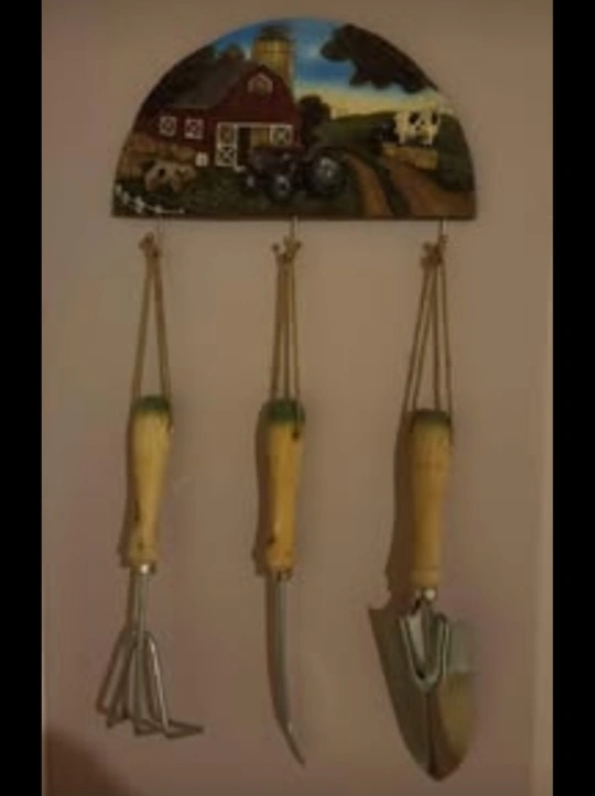 Adorable gardening tool set. Three pieces hang from a charming farmhouse-themed plaque. Perfect for a farm decor kitchen. Cash preferred, no holds, must pick up, no price negotiation at the door