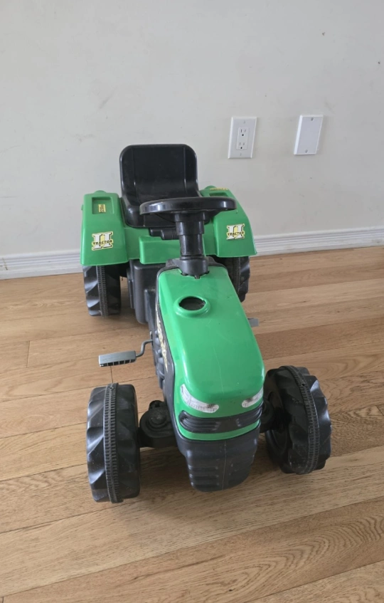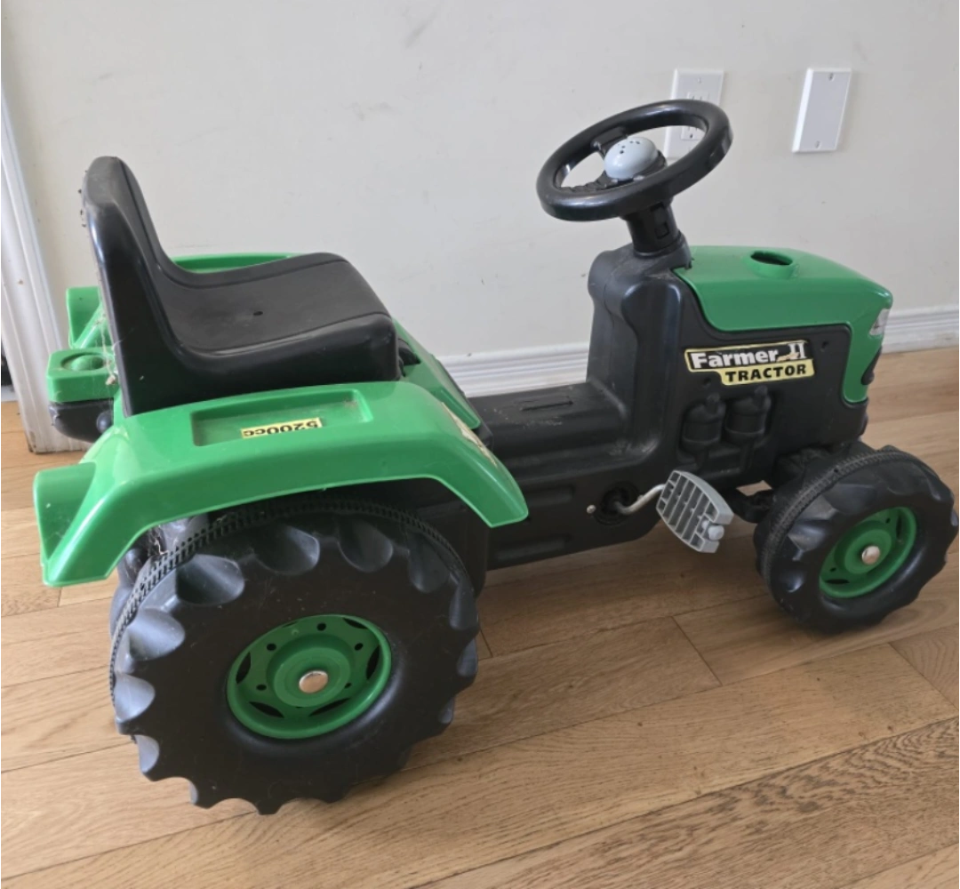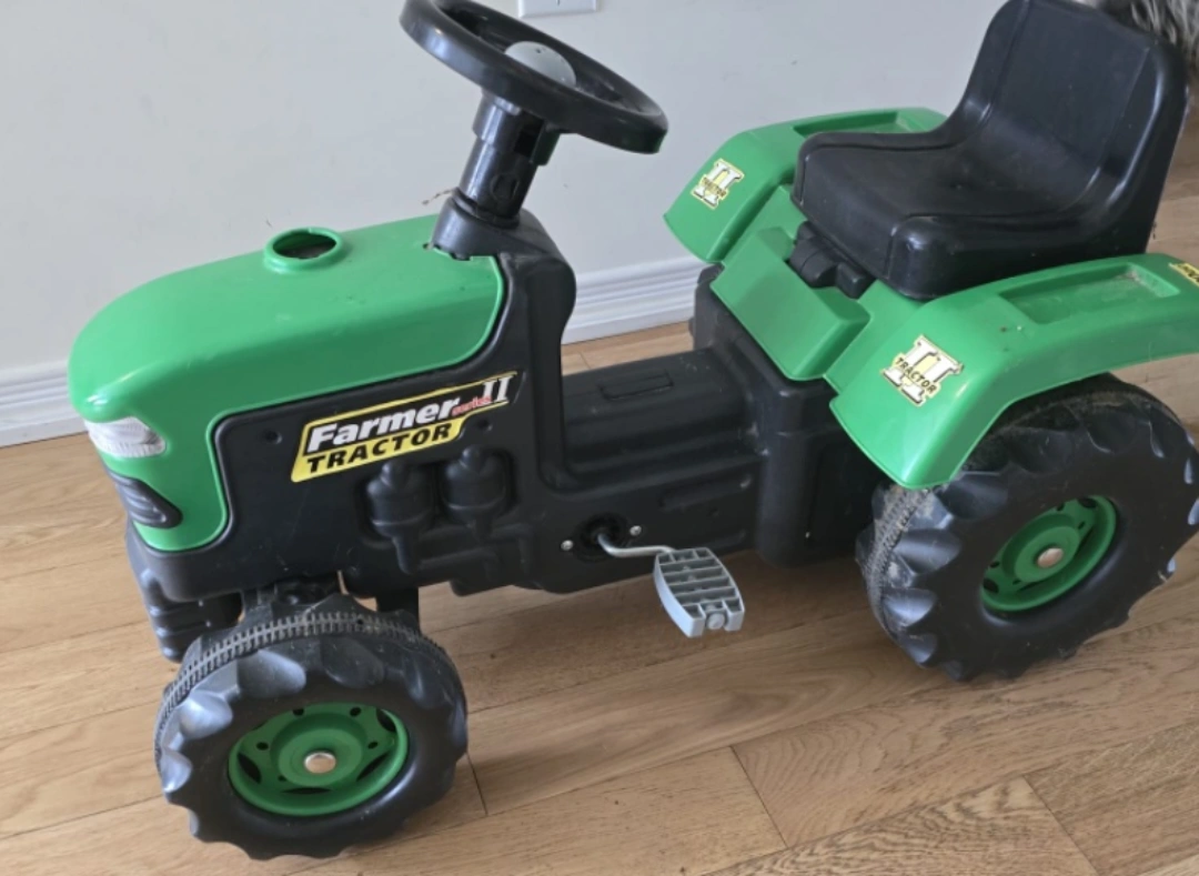 Selling a Farmer II tractor ride-on toy. It's green and black and perfect for a little one who loves tractors! It shows some signs of use, but it's still in good condition and ready for more adventures