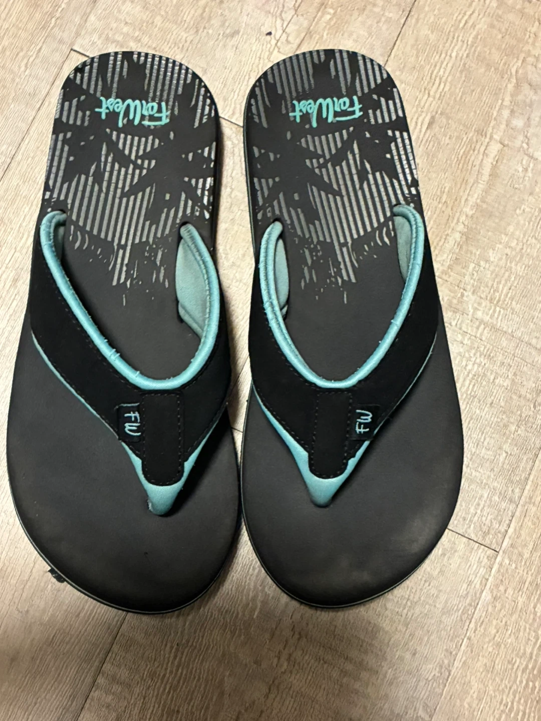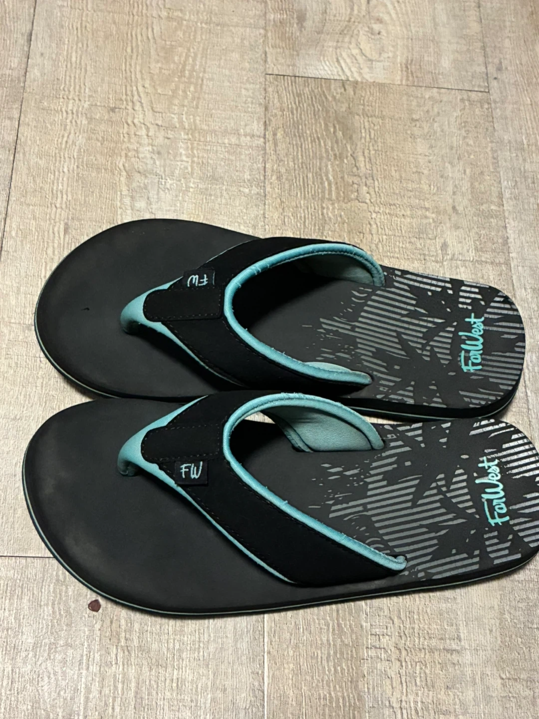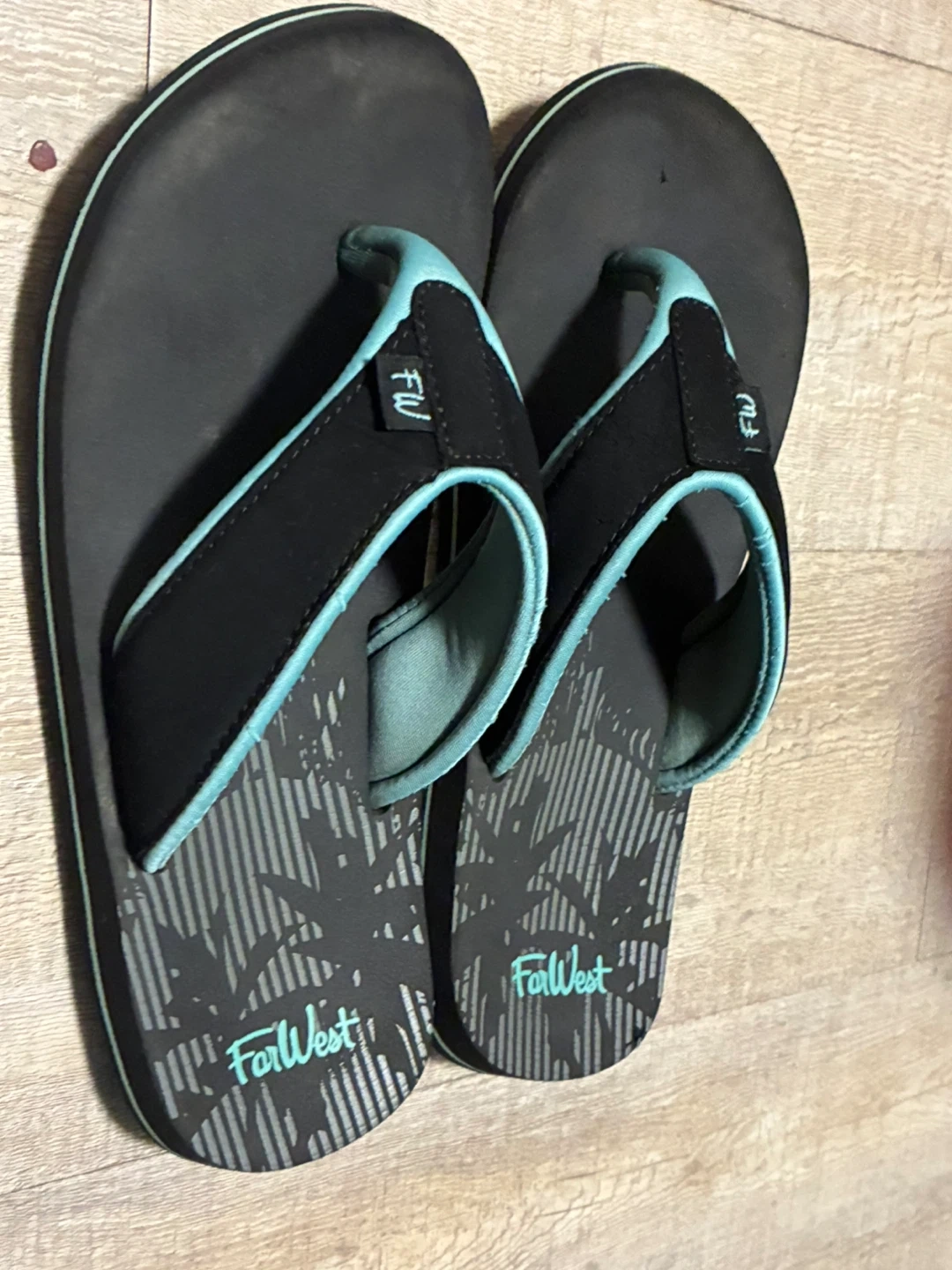 Selling a pair of FarWest flip flops. They are black with a turquoise accent. Great for summer!