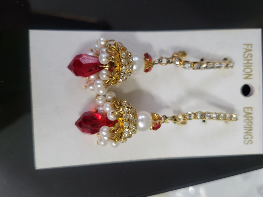 Selling a pair of fashion earrings. They feature a red gem, faux pearls, and gold detailing. Perfect for adding a touch of elegance to any outfit!