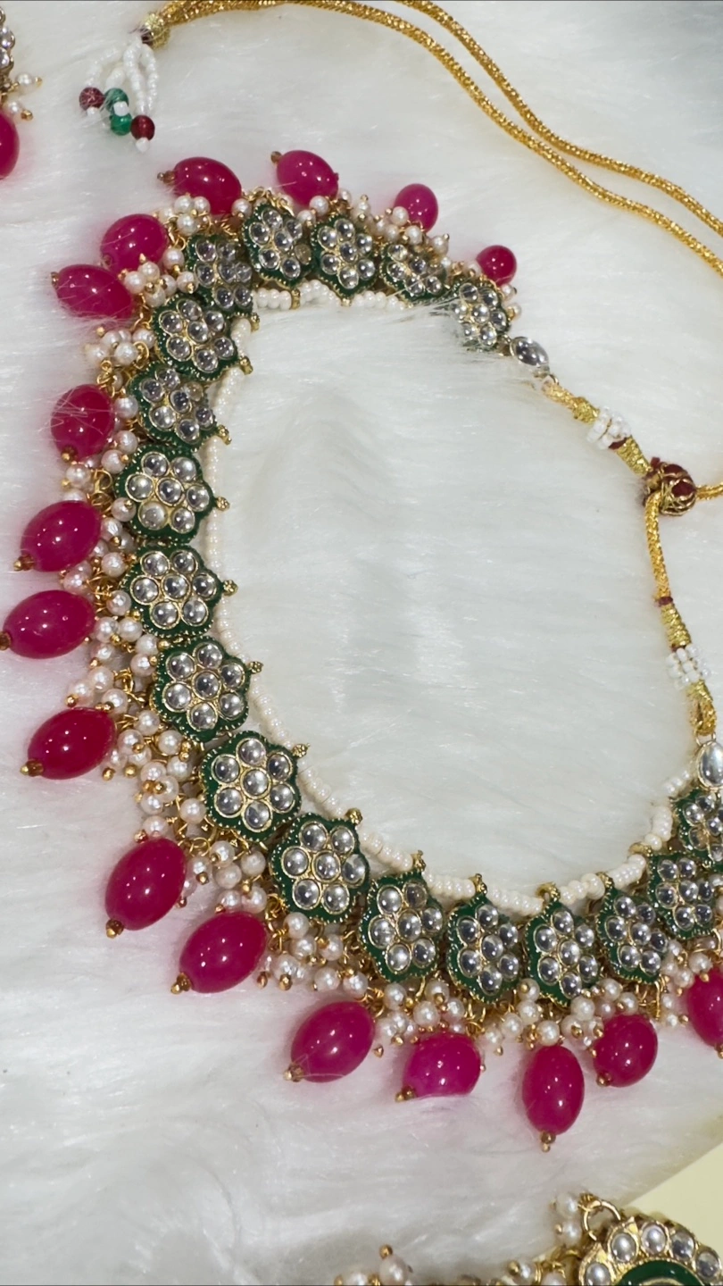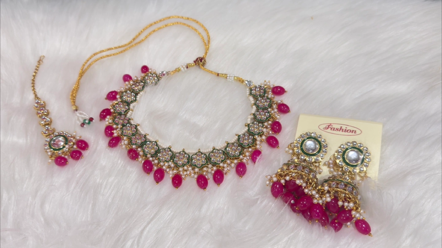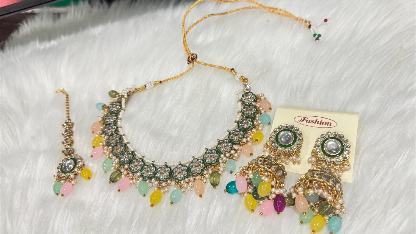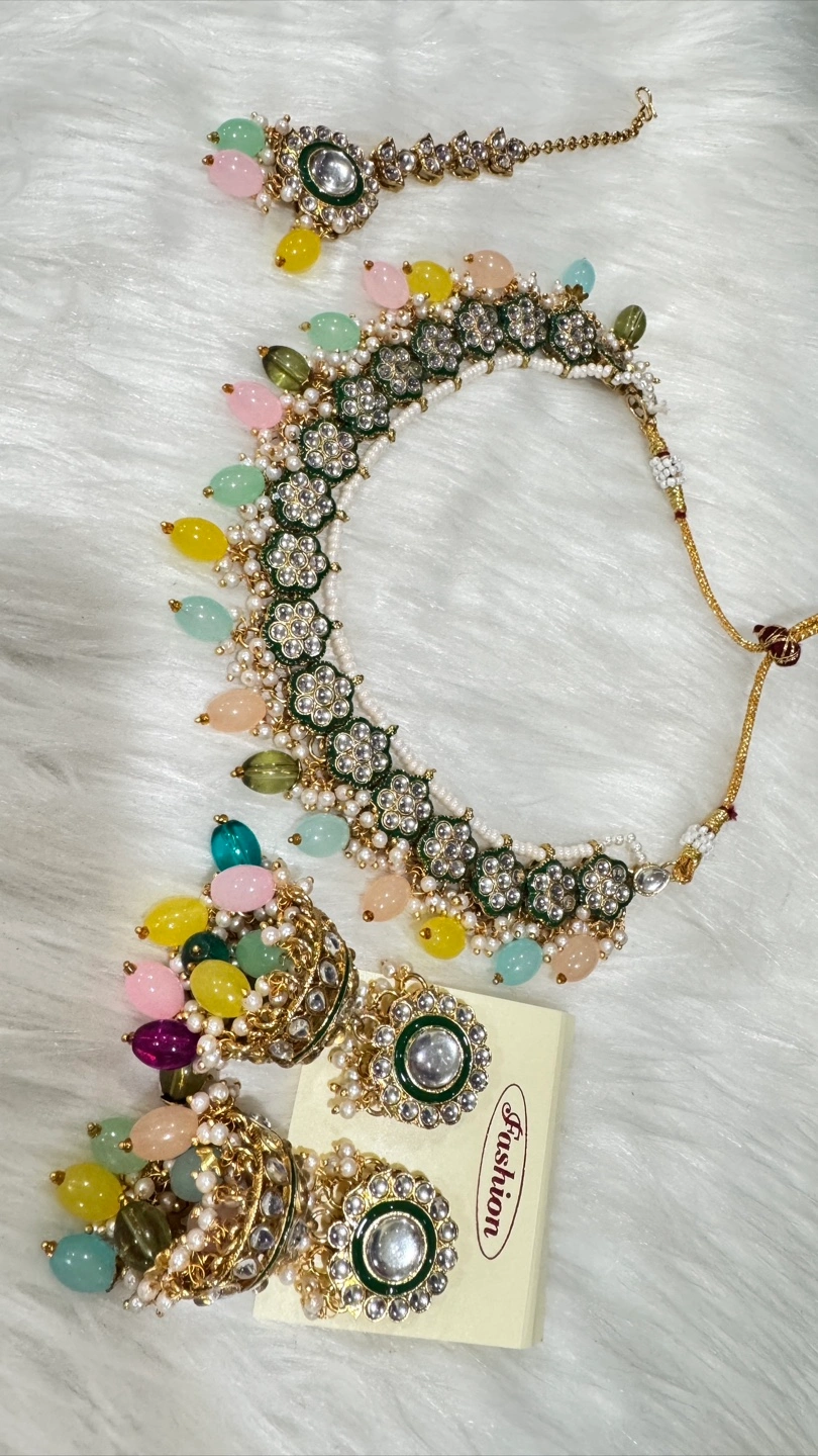 Selling a beautiful fashion jewellery set, perfect for adding a touch of elegance to any outfit! The set includes a necklace, a pair of earrings, and a tikka. The set features lovely detailing and vibrant colours.