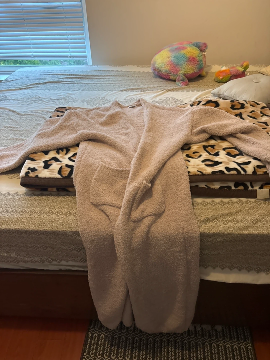 Selling a cozy Fashion Nova cardigan in a lovely light pink colour! It's a size medium and perfect for layering on cooler days or just lounging around the house. It's made of a soft, fluffy material and has a relaxed fit, making it super comfortable to wear. Don't miss out on this comfy addition to your wardrobe!