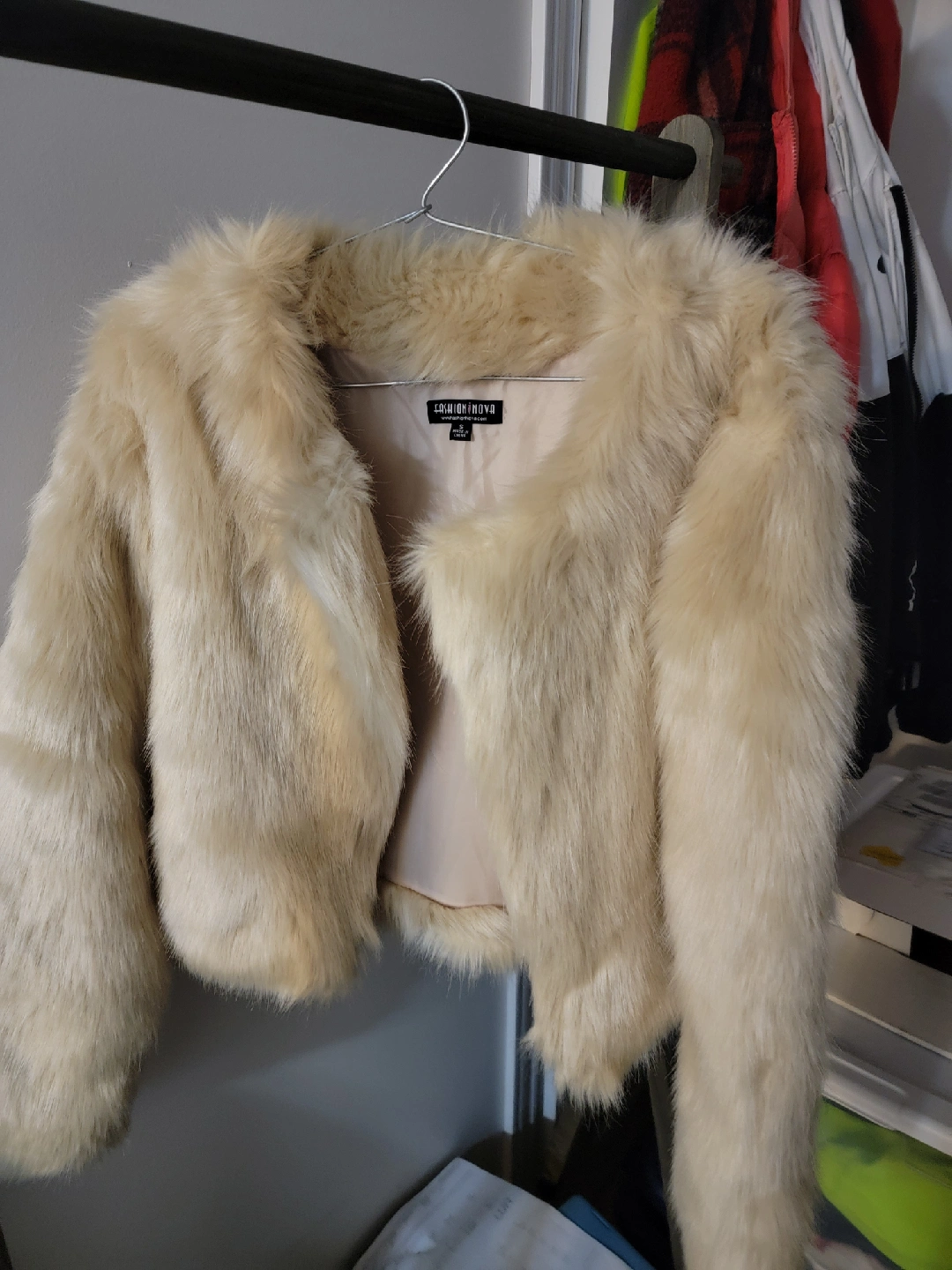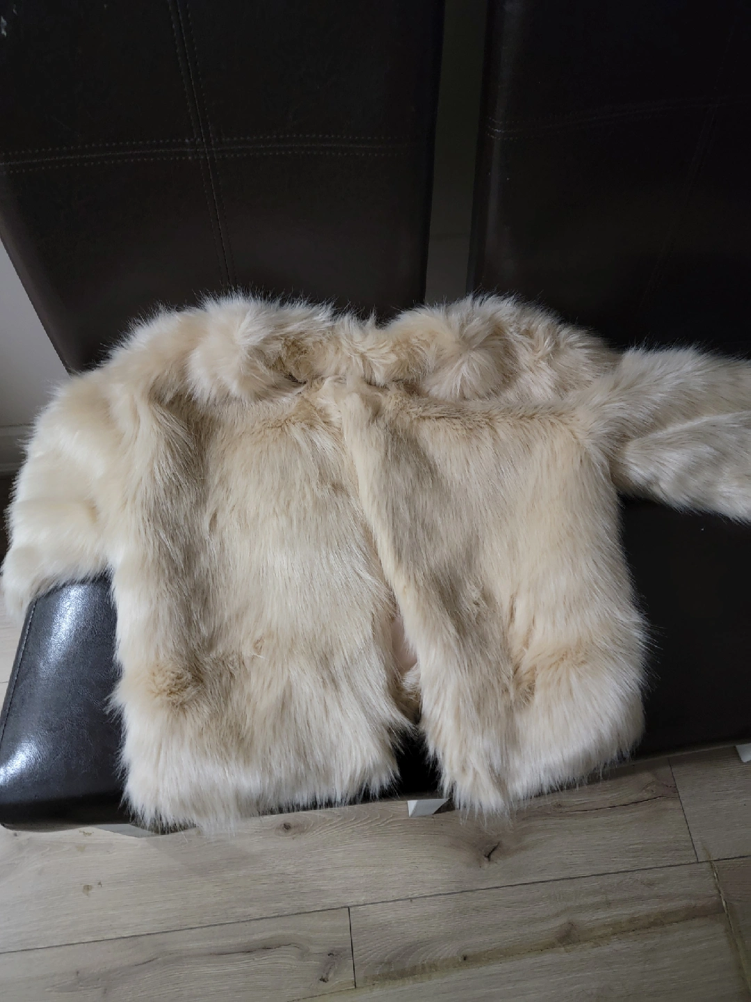 Selling a Fashion Nova faux fur jacket in a size small. It's a cream colour and in great condition! Perfect for adding a touch of glam to any outfit. wore it once only for couple of hours