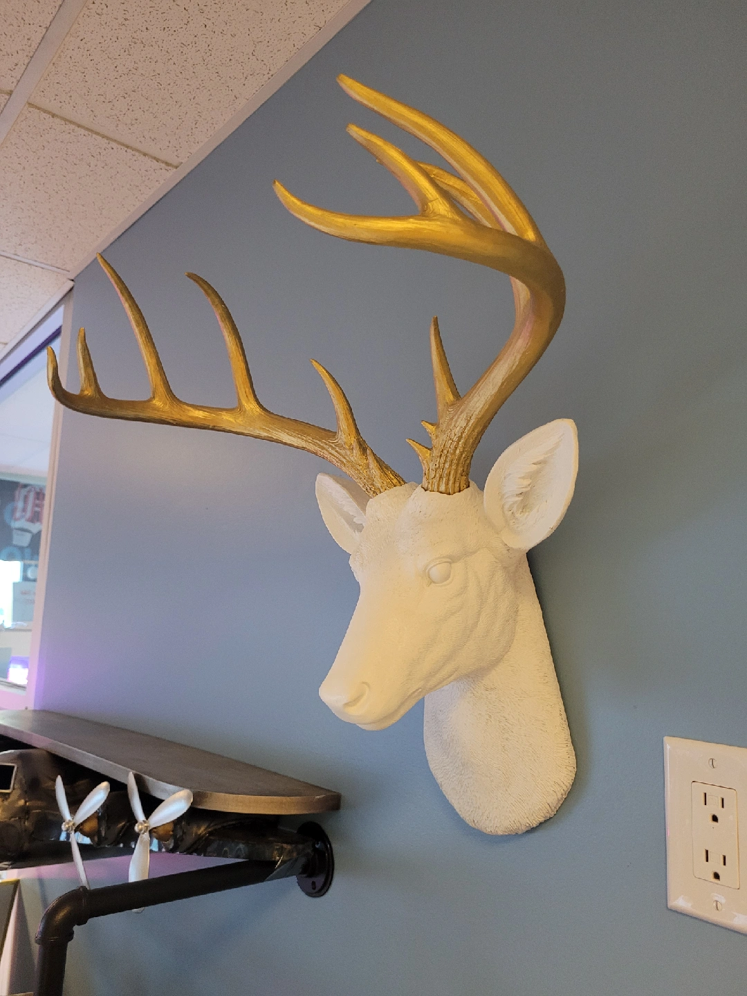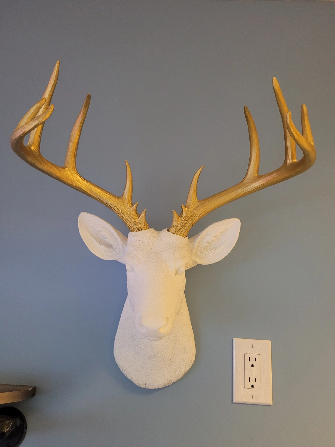 Looking to add a unique touch to your home decor? This faux deer head wall mount is perfect! It features a white deer head with gold antlers, adding a modern and stylish look to any room. Size: 18 inches wide x 18 inches high * Pick up in store at 258 Main Street South, Newmarket (by appointment only to guarantee we are open). *** Payable by cash, debit or credit ***