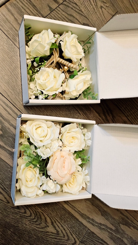 Features faux roses and greenery. ideal for intimate wedding 4 cream colour boutonnieres, 4 cream corsages, 1 blush pink corsage