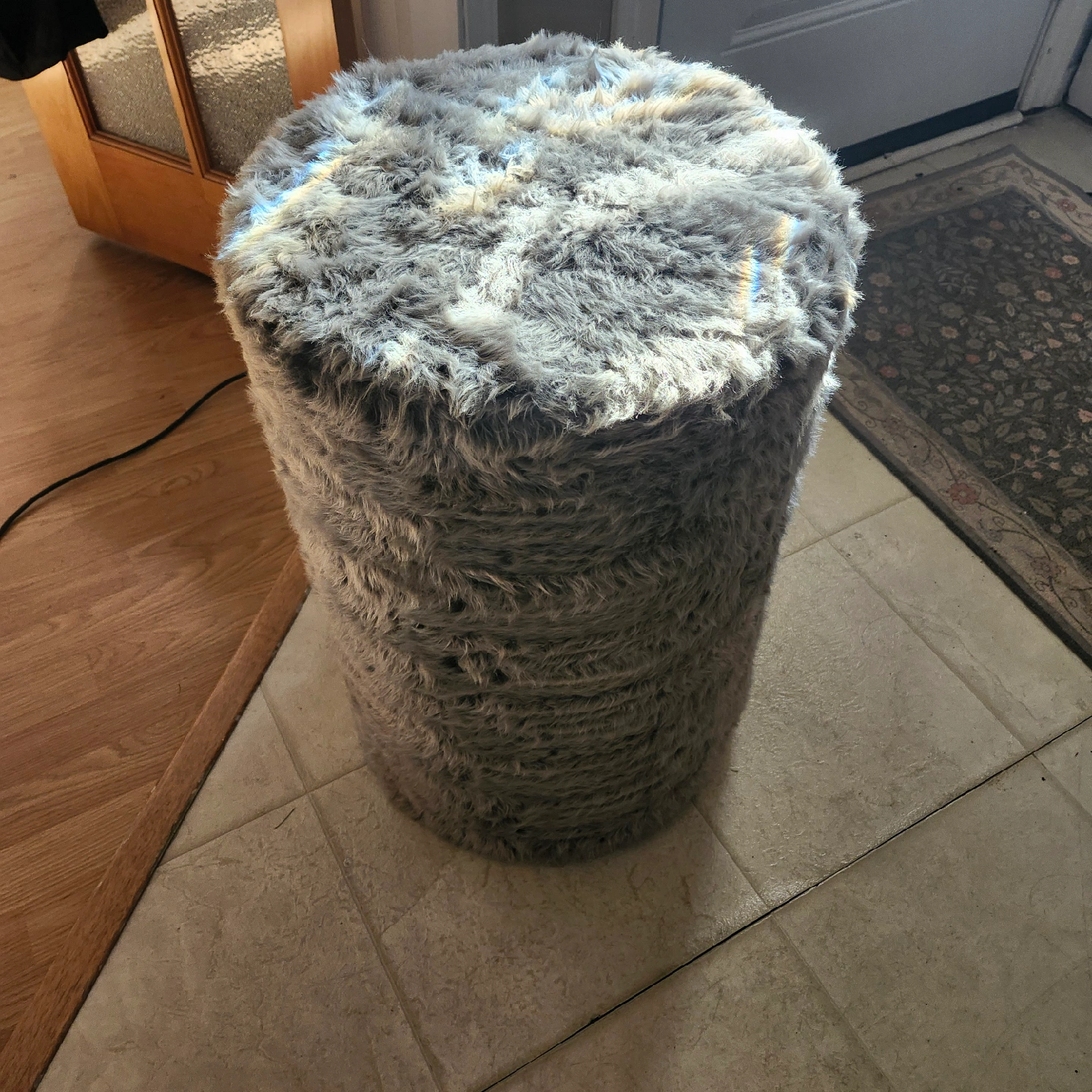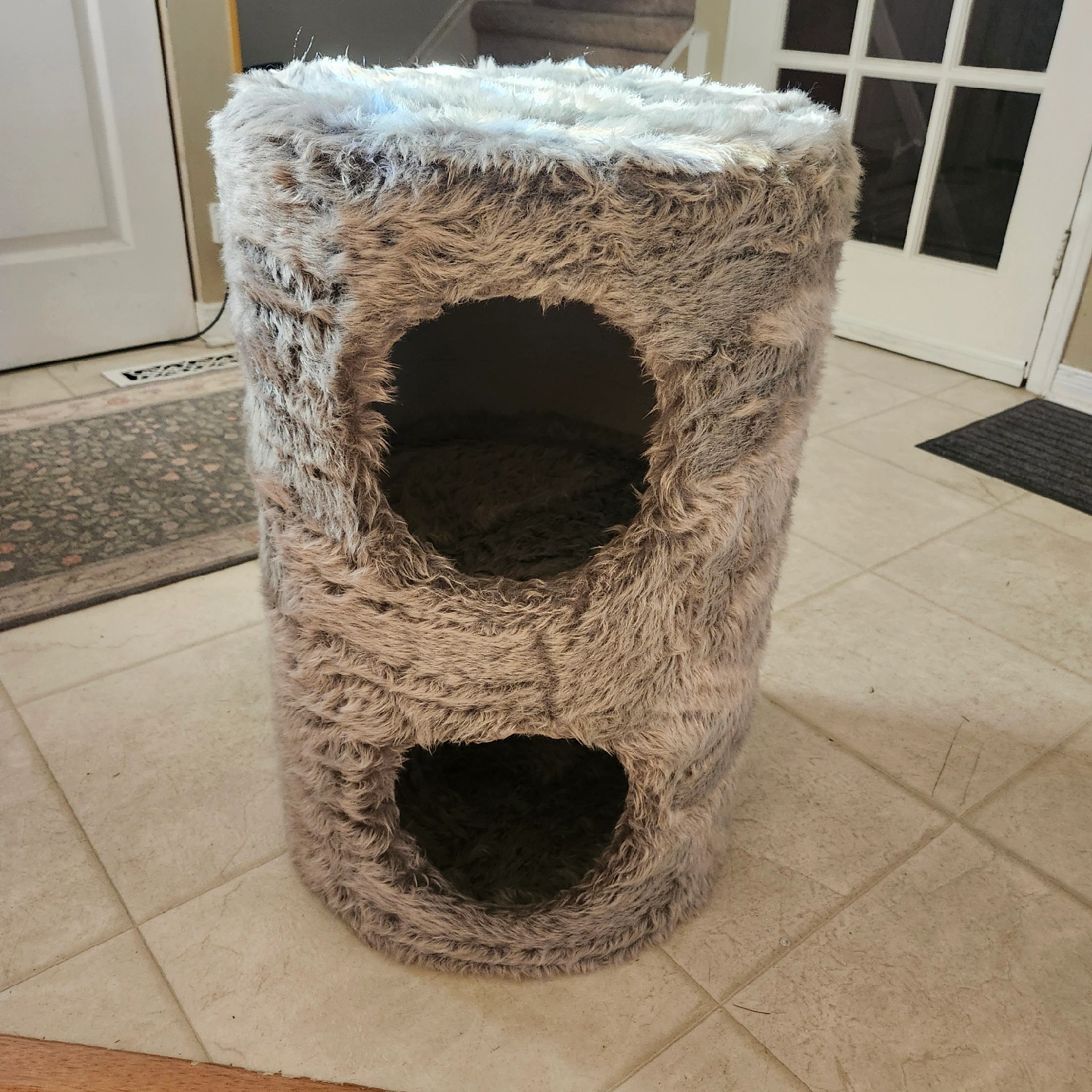 Selling a cat tower with a faux fur exterior! It has a cozy design with multiple openings for your cat to explore and relax in. It's in great condition and ready for a new home
