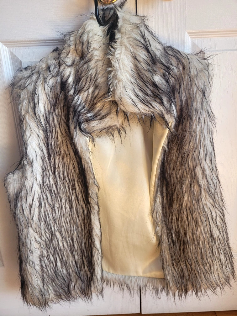 Selling a stylish faux fur vest in a mix of white and grey tones! It's in great condition and perfect for adding a touch of warmth and style to any outfit