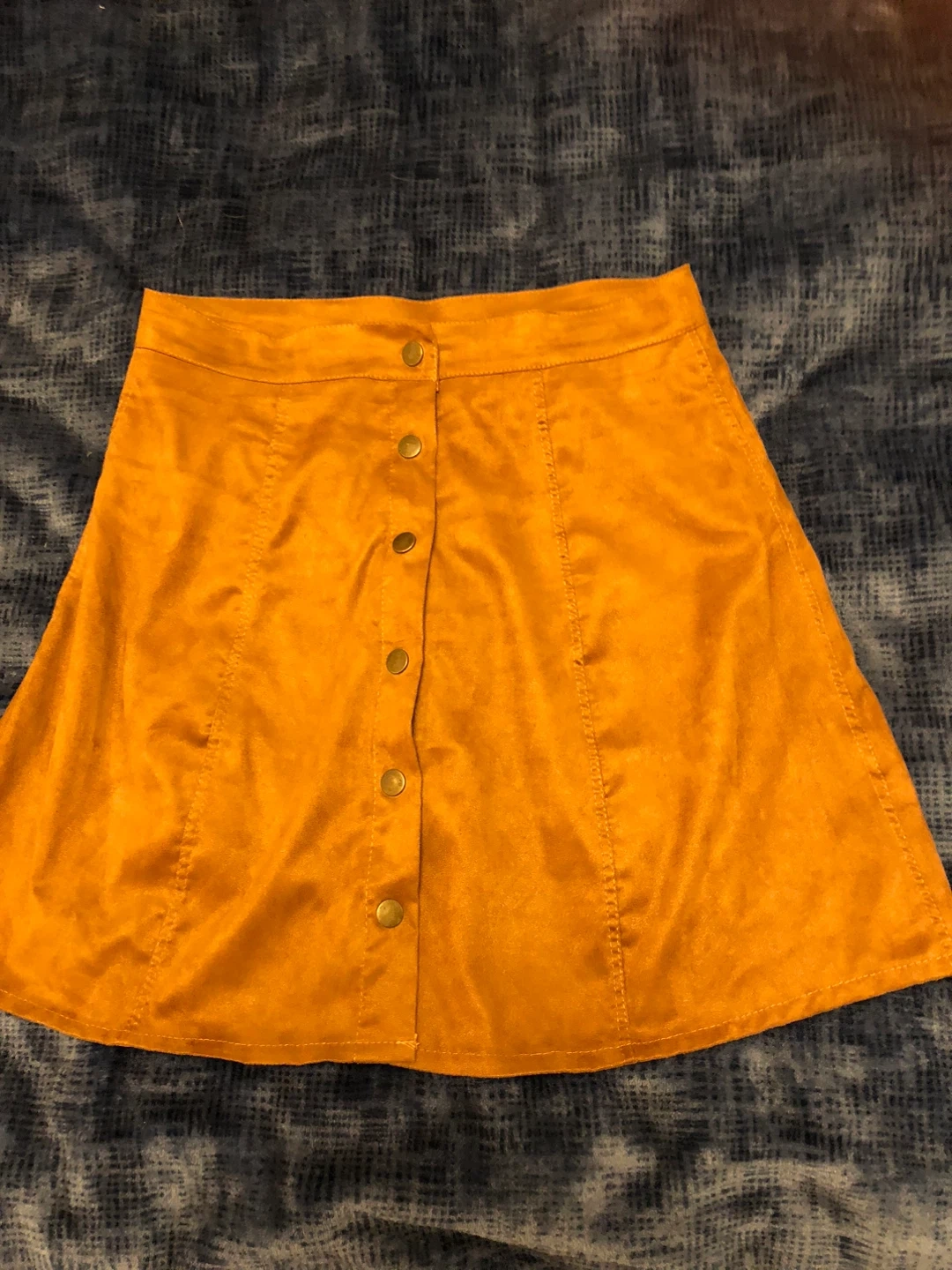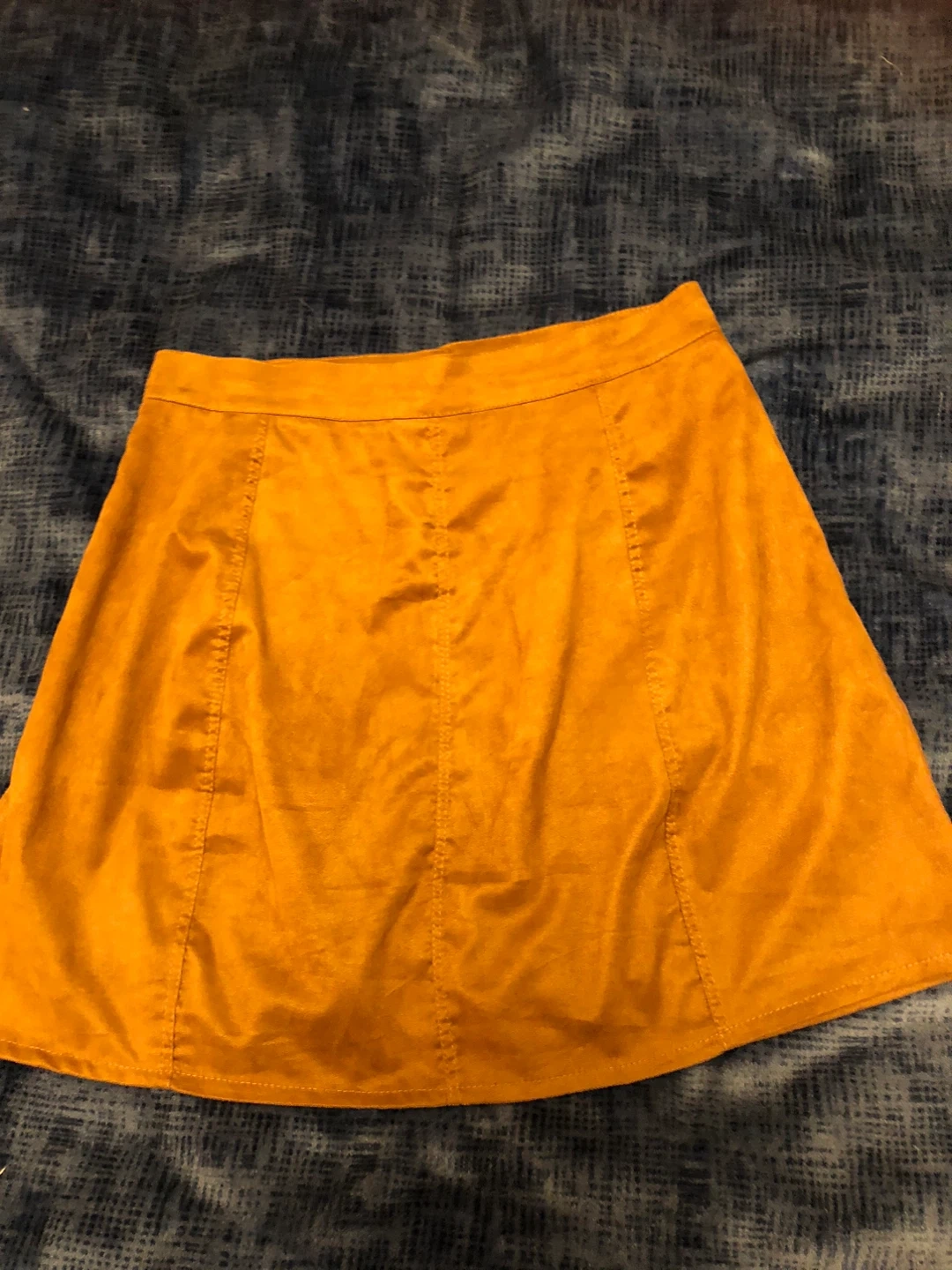 Selling a cute fawn suede look skirt in size medium! It's made of 35% cotton and 65% polyester. The skirt has a button-down front and would look great with a variety of tops