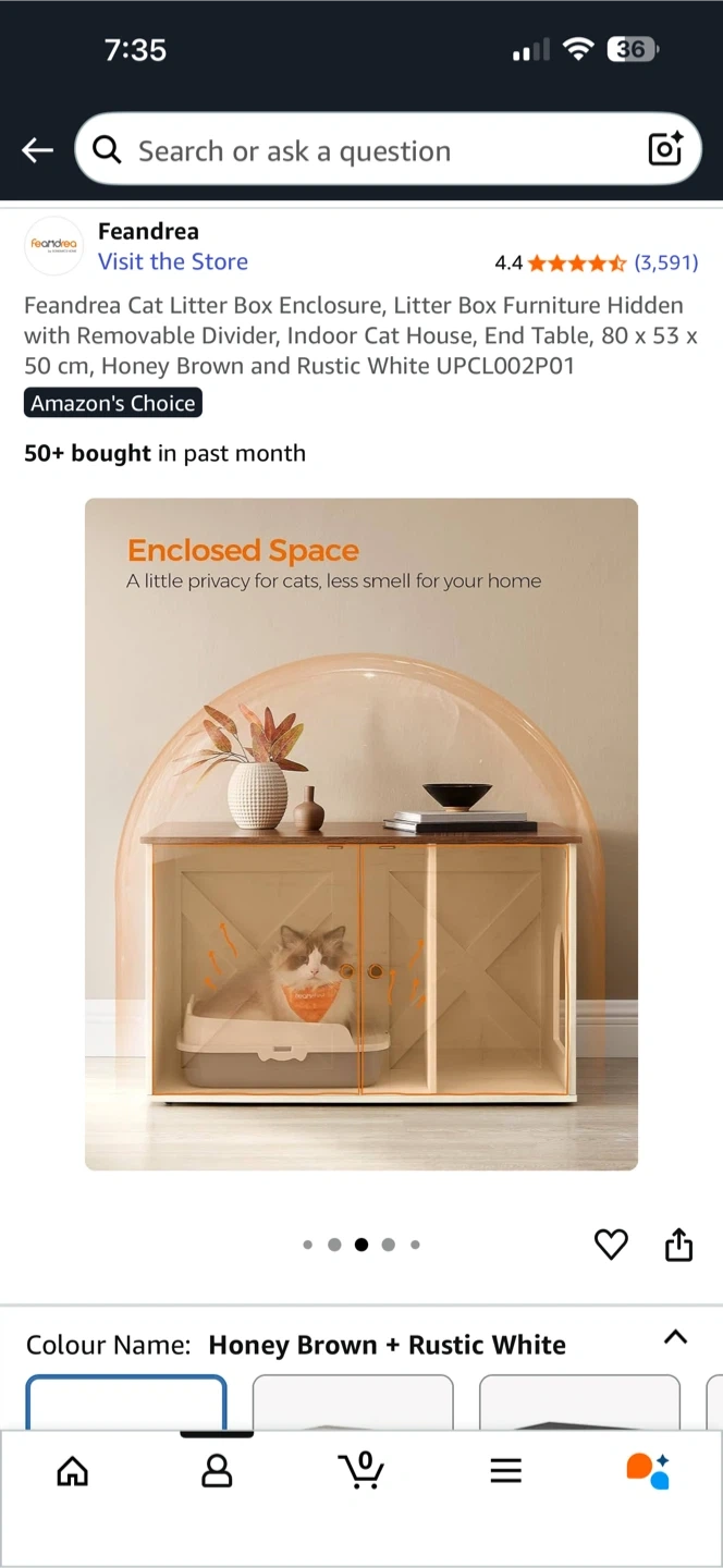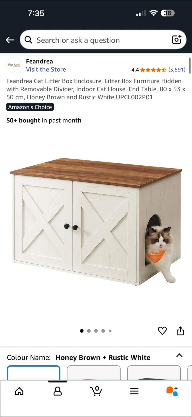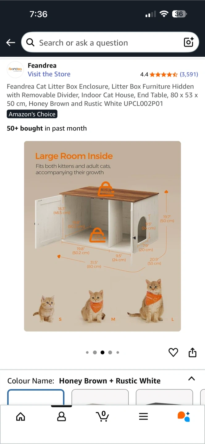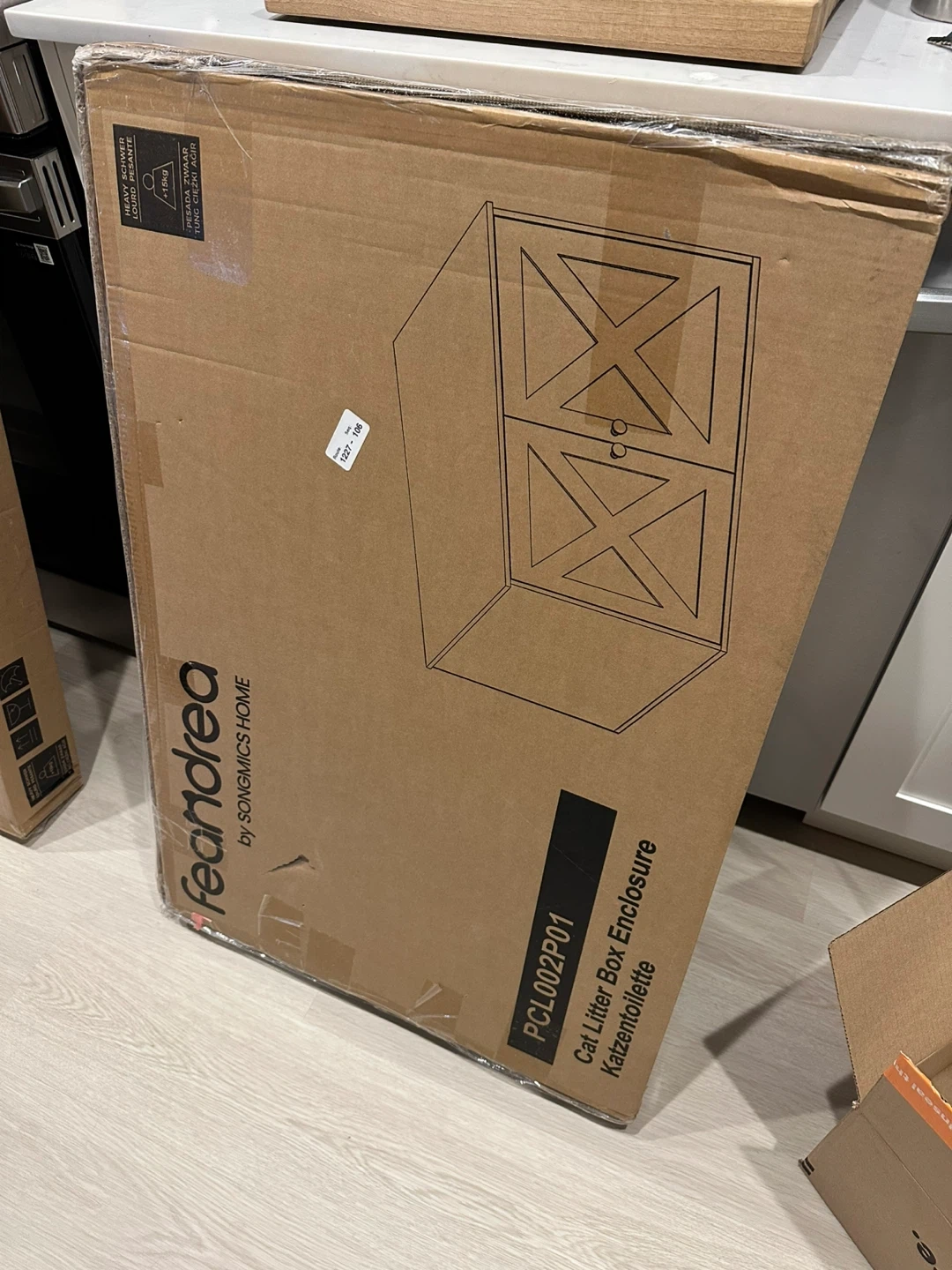 Selling a Feandrea cat litter box enclosure in honey brown and rustic white! It's a hidden litter box furniture piece that can also be used as an end table or cat house. The dimensions are 80 x 53 x 50 cm. It’s brand new in box still, just bought two by accident and Amazon wanted to charge me too much to ship it back.
