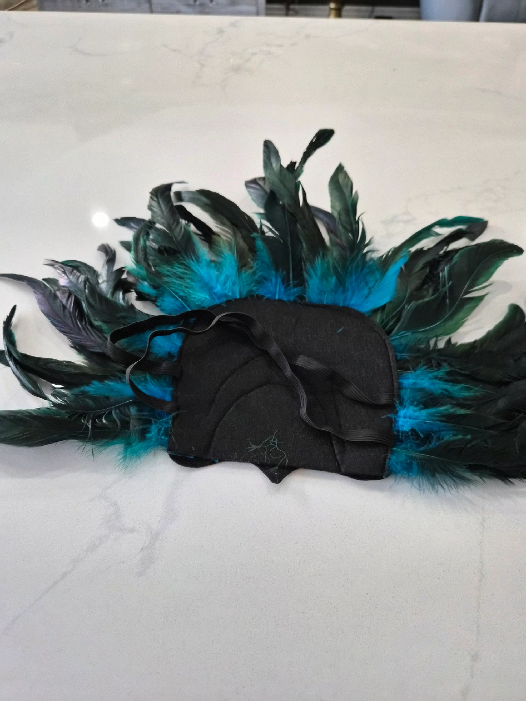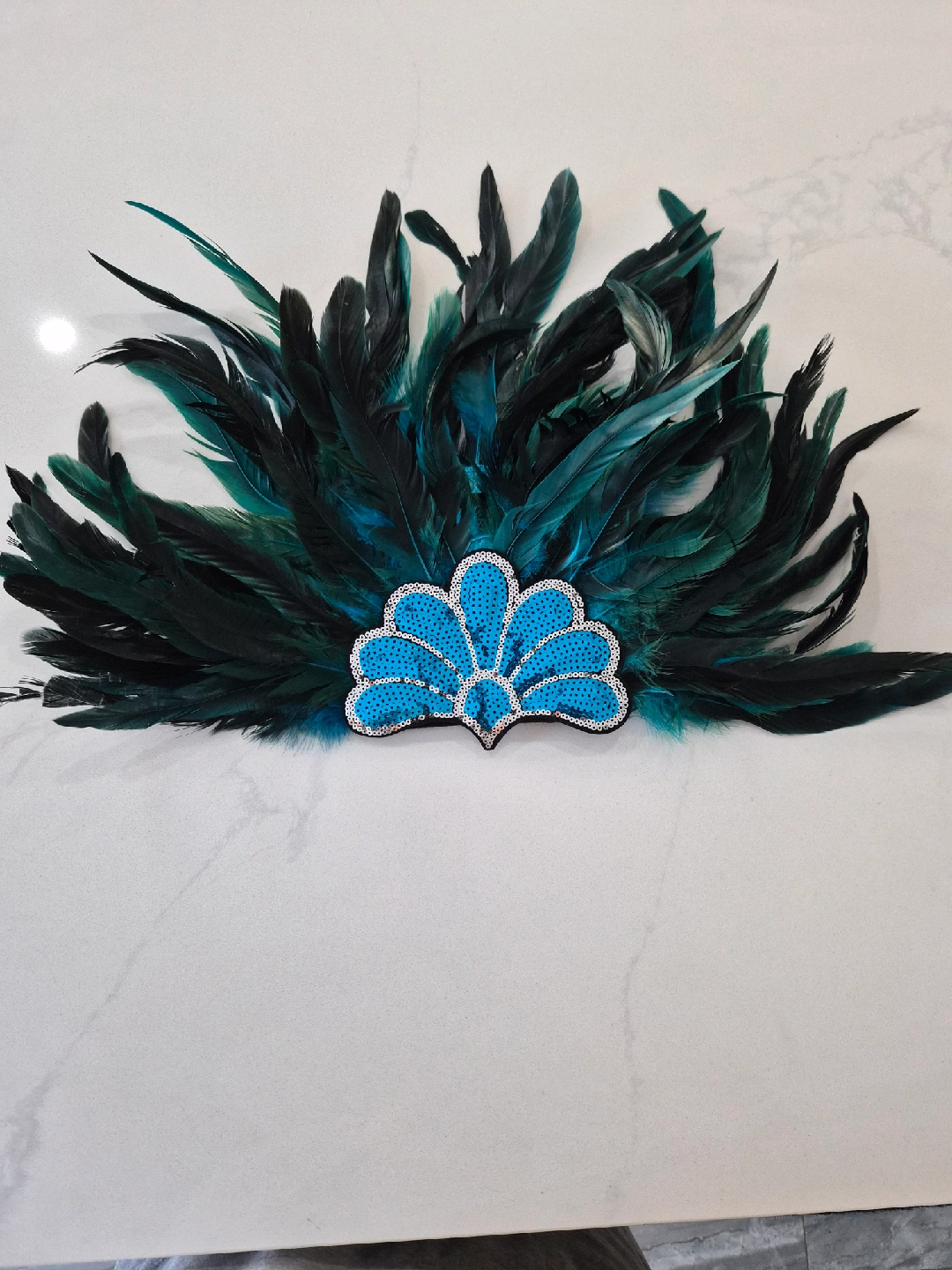 Unique feather headdress with teal and black feathers and a blue sequined accent. It's in great condition and ready to add some flair to your next event or costume