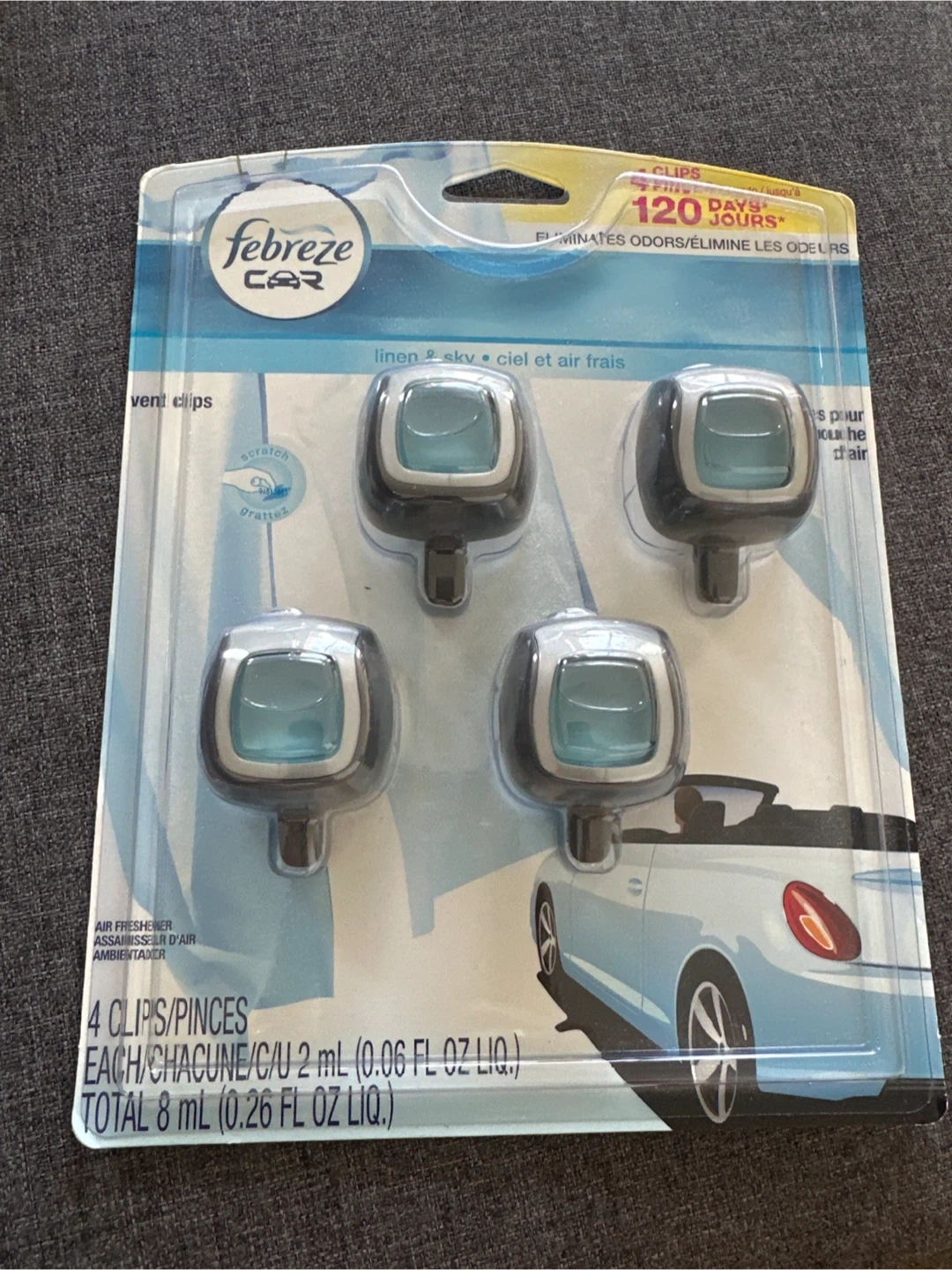 Freshen up your car with these Febreze Car vent clips in the Linen & Sky scent! This pack includes four clips, each containing 2 mL of fragrance, for a total of 8 mL. They eliminate odours and keep your car smelling fresh for up to 120 days!
